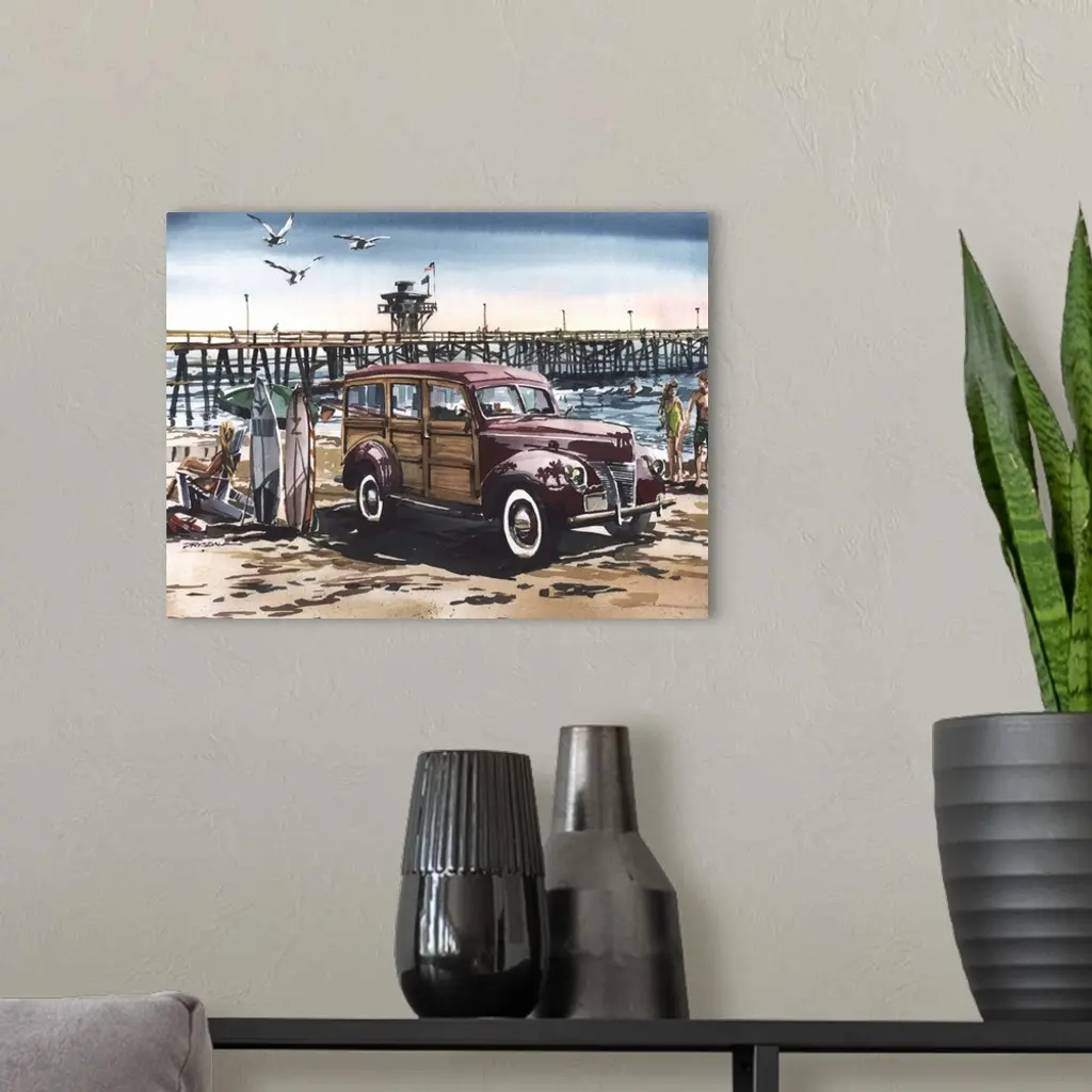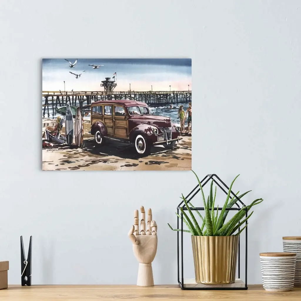 Watercolor painting of a 1940 Ford Woodie at the San Clemente pier.