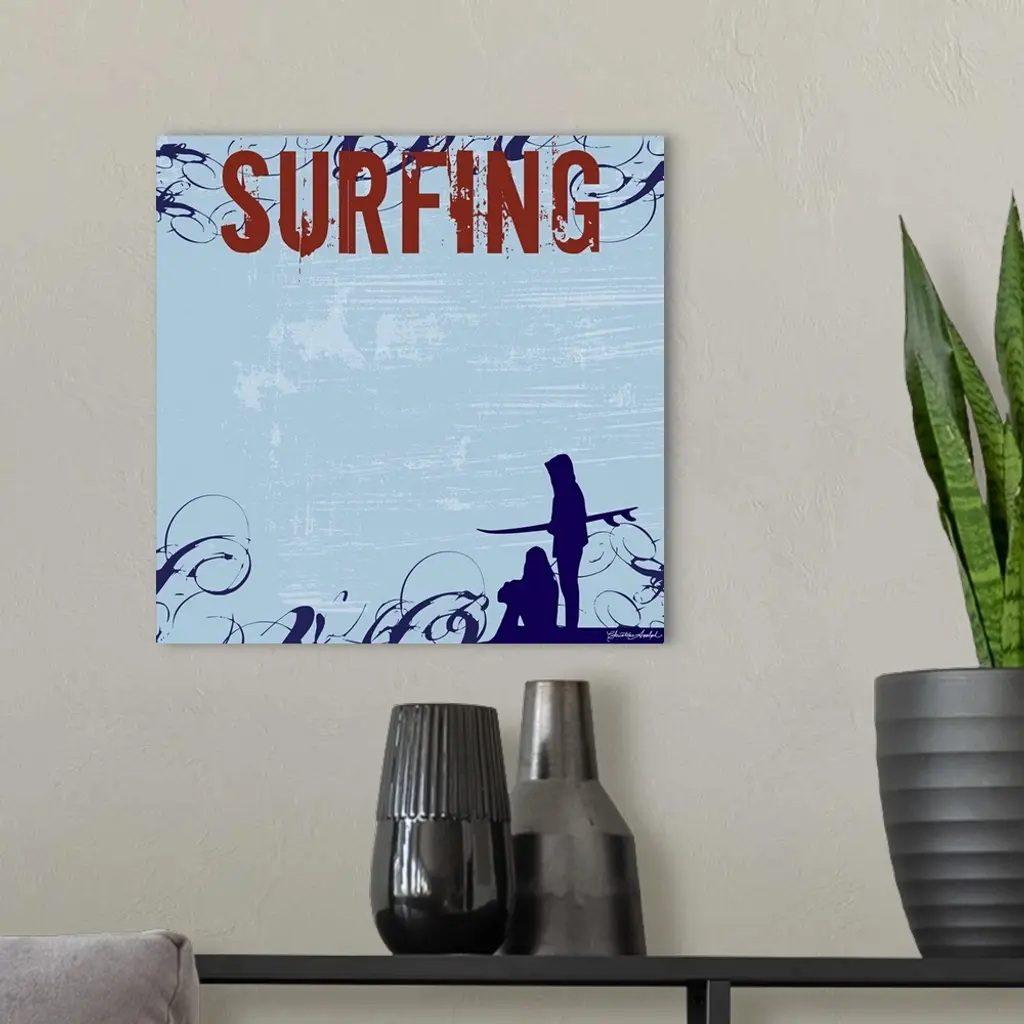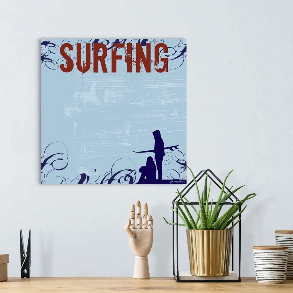 The silhouette of two people is drawn at the bottom of this artwork with the word surfing in bold font at the top leaving a blank space in between.