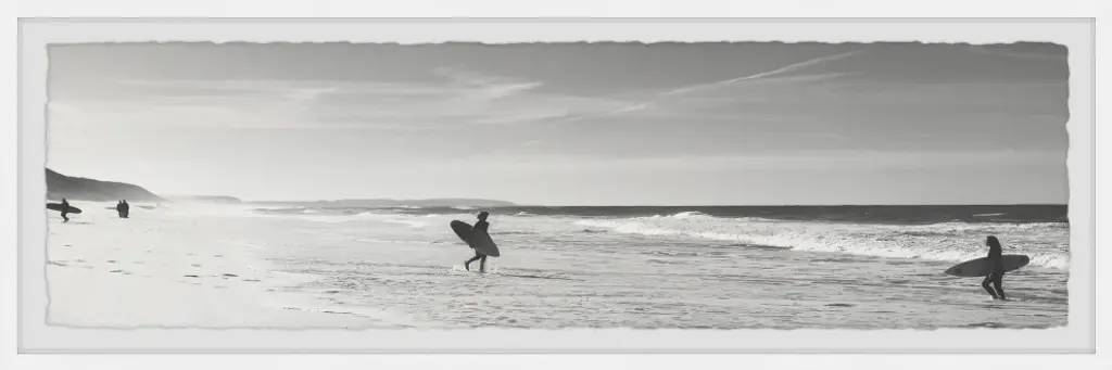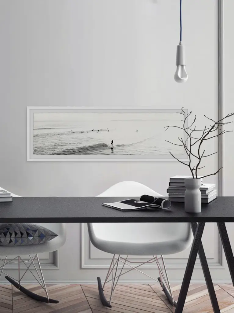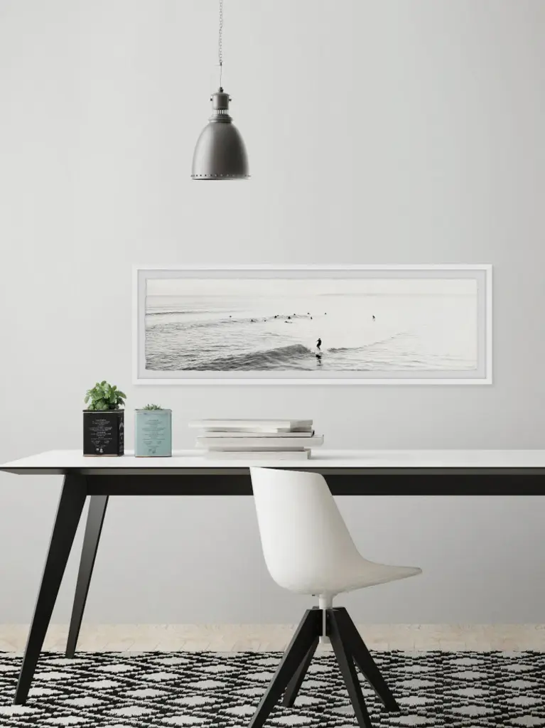 Channel your love for the ocean with this black and white print that showcases a high-up point of view of surfers making their way through the waves. Proudly printed in the USA, this piece is printed on high quality archive paper and professionally hand-framed. With wall-mounting hooks included, this artful accent is ready to hang up as soon as it reaches your front door.- Top quality Gicle print on high resolution Archive Paper- Hand cut deckled edges- High quality durable non-warping frame- Finished under shatter resistant plexiglass- Arrives ready to hang- Includes a certificate of authenticity- Printed in the USA
