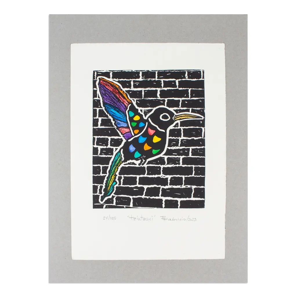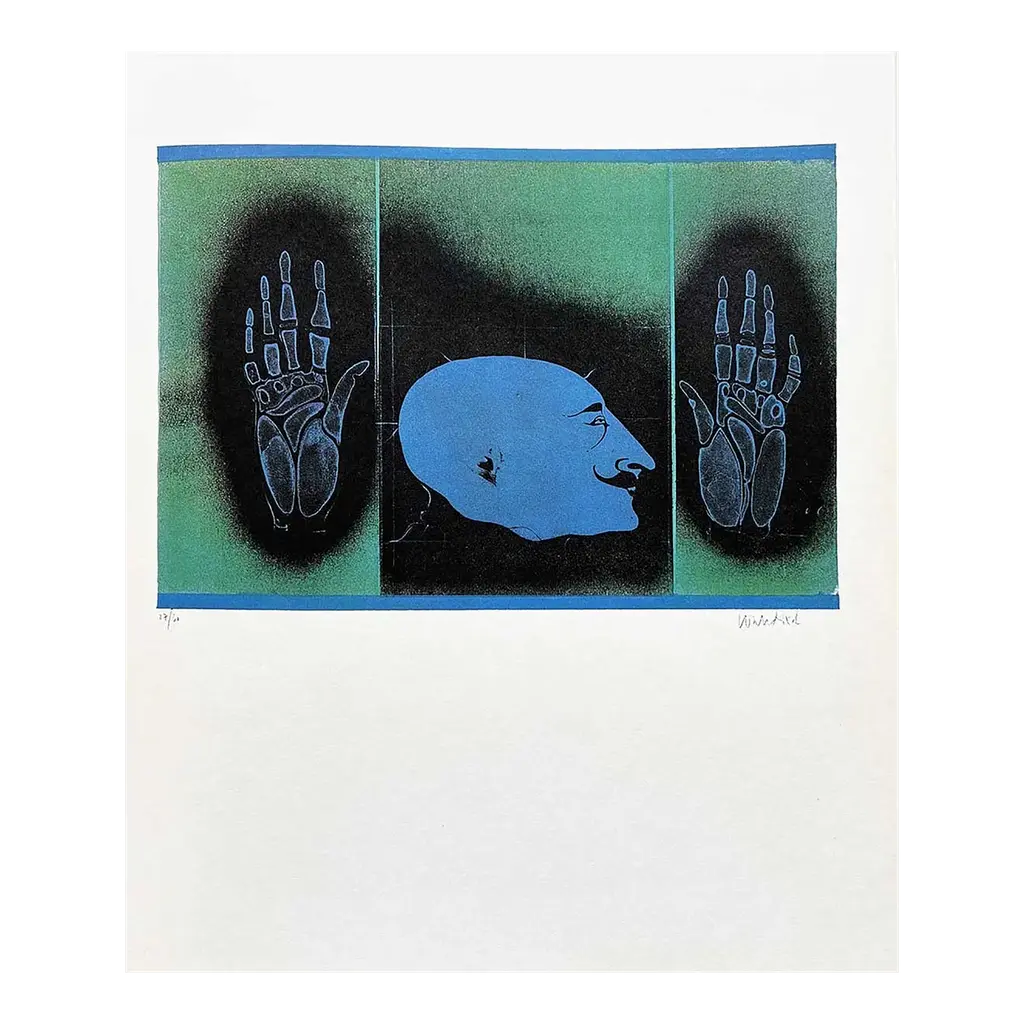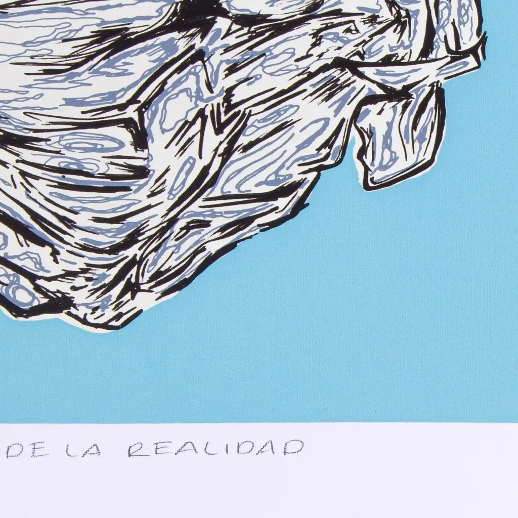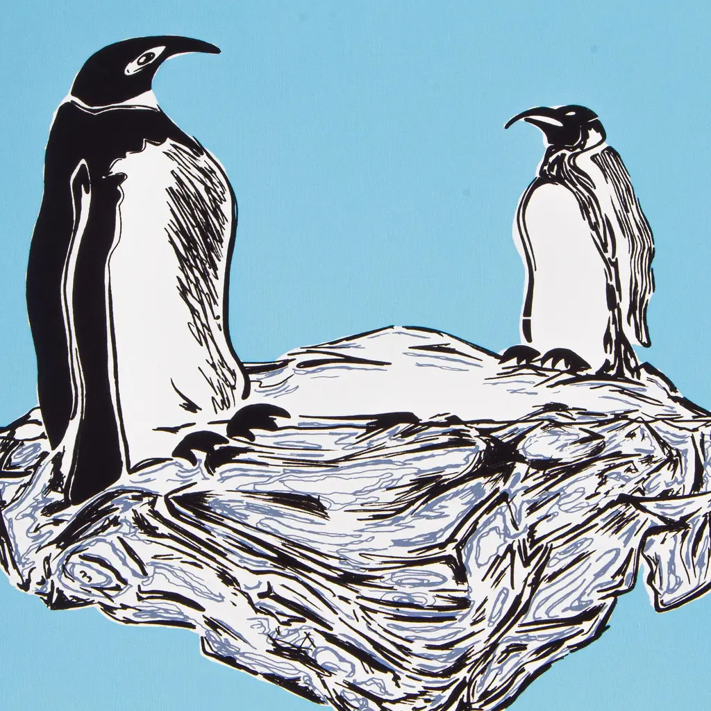 Bertha Martin del Campo illustrates the clash between reality and perception in this silkscreen print of two penguins on an iceberg against a sky blue background. "When the decision is to exchange wings for fins, this leads us to discover a different perception of a reality for every being. Inside all of us is a little-known story that we can only understand once we open our own consciousness." The artist signs her work "Maca." Titled 'Percepción y realidad' in Spanish.