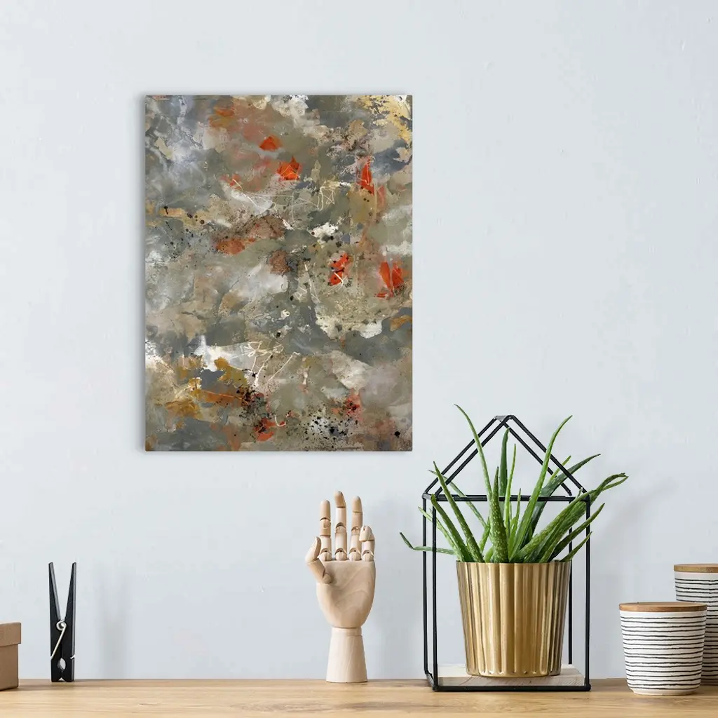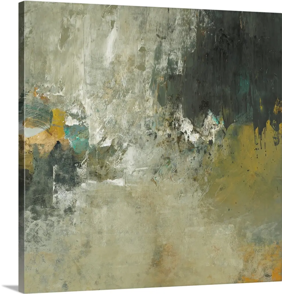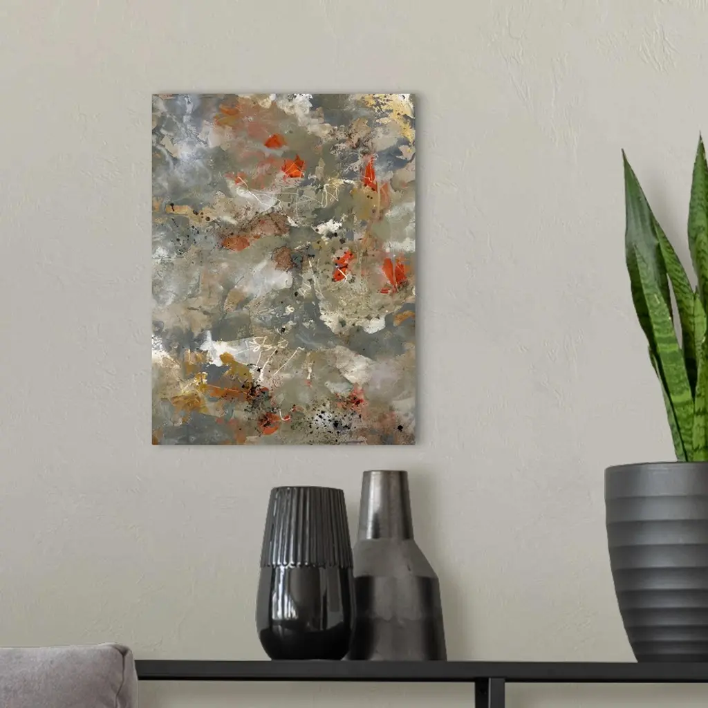 Big abstract painting on canvas of blotches of color layered on top of a grungy neutral background.
