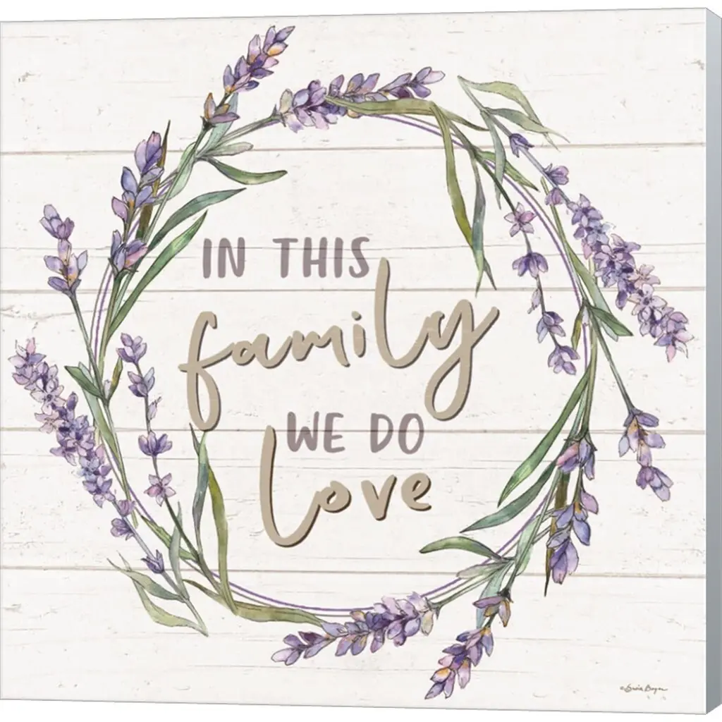 In This Family by Susie Boyer is a high quality piece of canvas artwork. The finished size of this piece is 12" X 12", and it has a depth 1.5" with wintergray painted sides. There is a UV protective coating over the entire image, and it is ready to hang on your wall with no hardware required. 100% Satisfaction Guaranteed.