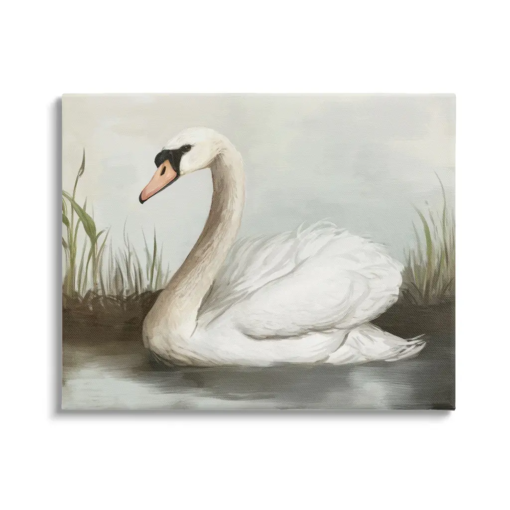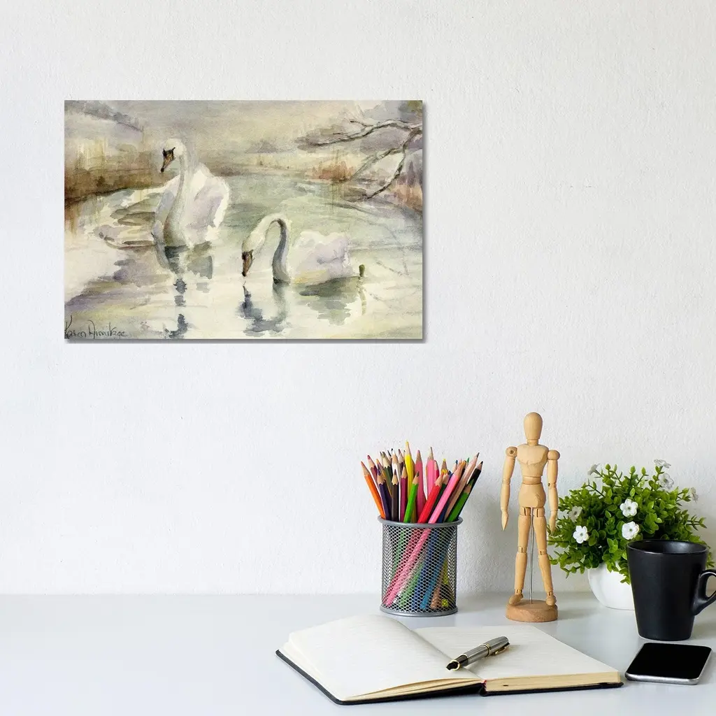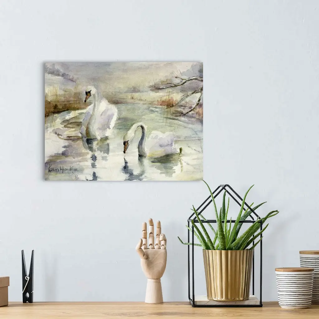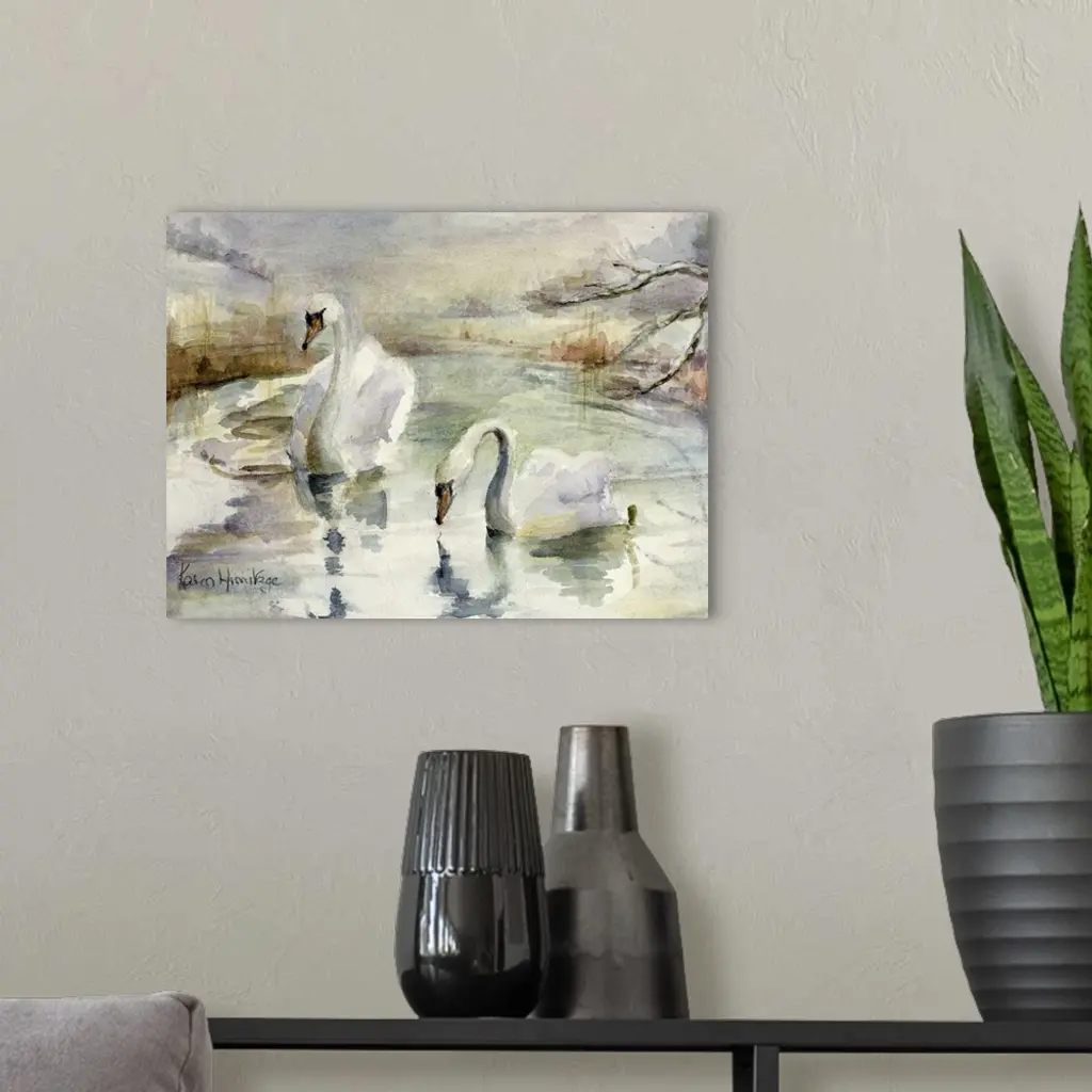 Oversized horizontal artwork of two swans floating in the calm waters of a pond, surrounded by a natural landscape.