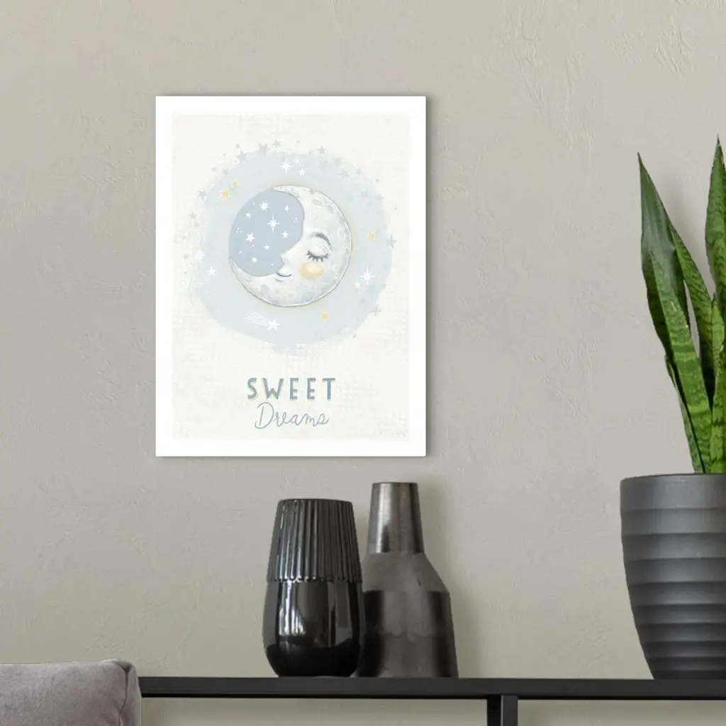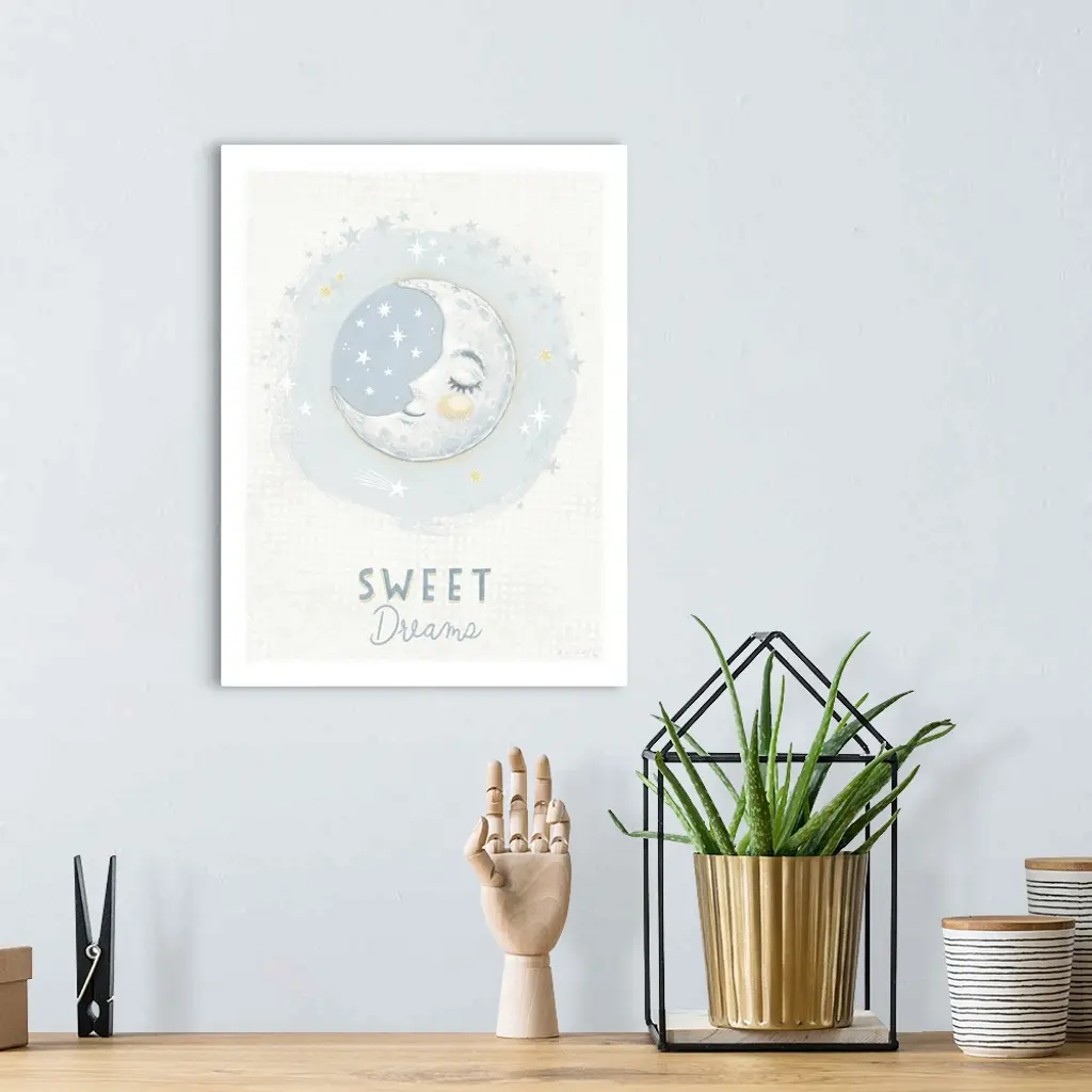 A sweet and softly rendered painting of the man in the moonoperfect for any nursery.