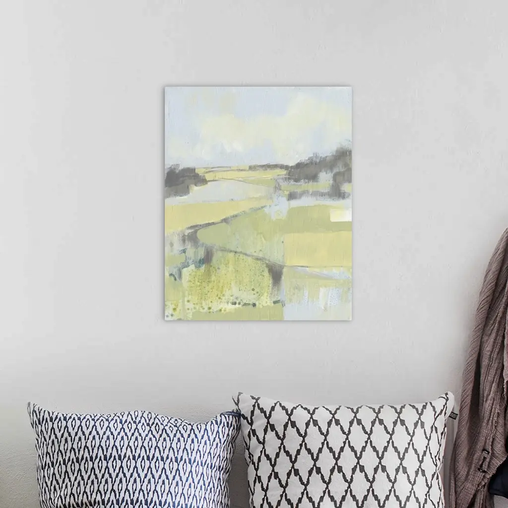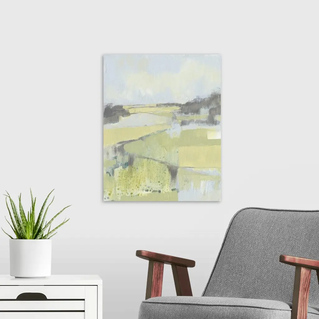 Blocks of color created with textured brush strokes construct rolling hills in this countryside landscape painting.