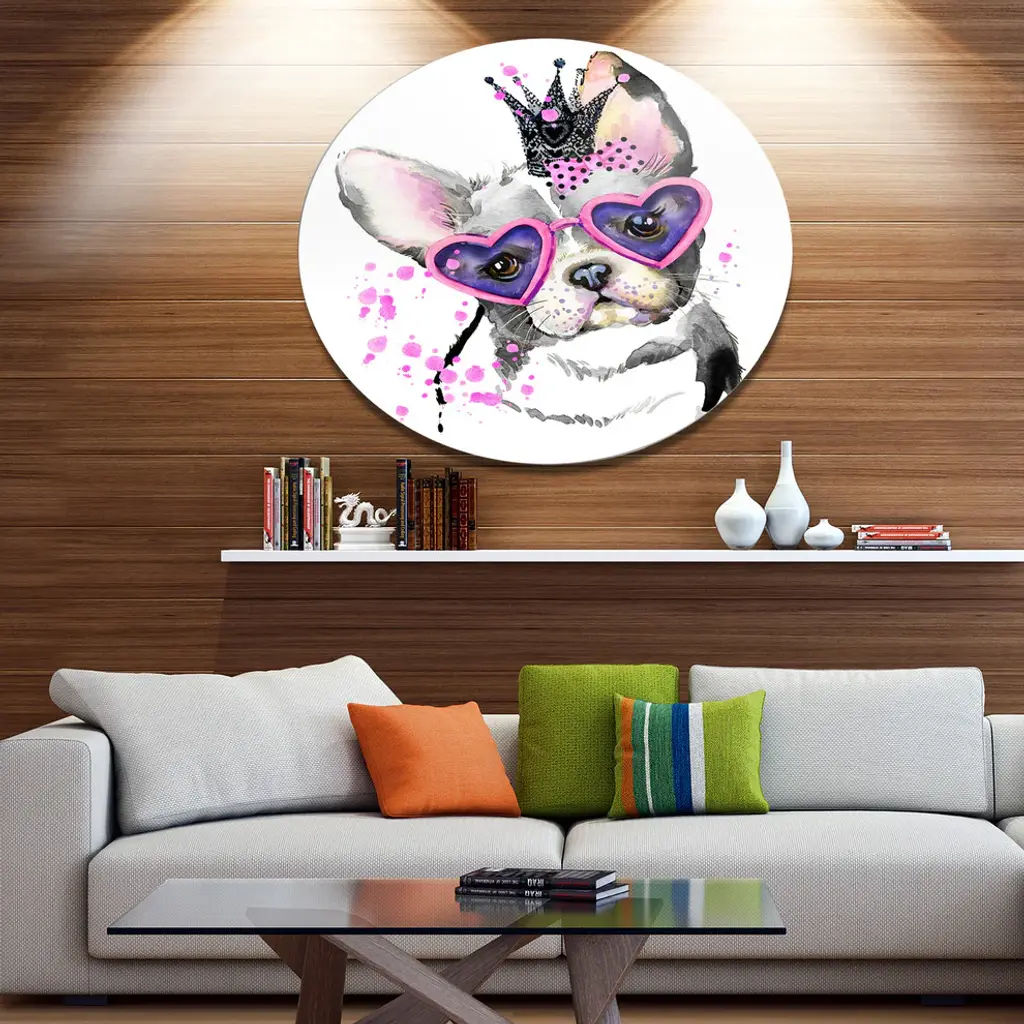Bring Contemporary Abstraction to your home with this large Circle Metal wall art. This Sweet Funny Dog with Glasses Metal Artwork makes it the focal point of any room or office. - White Gloss Coating ensures colors are extra vibrant with light reflection.- Aluminum grade Sheet Metal with 1 inch mounting frame on the back giving the illusion that the artwork is floating on the wall..- Mounting Brackets are included along with instructions.- High Quality Digital images are created directly into a glossy aluminum panel producing a stunning and captivating print into the glossy finish of the metal.- Water, Fire and Scratch resistant HD Aluminum panels.- Looks better than any photo paper and guaranteed to last at least 20 years- Easy to clean with a microfiber cloth. Colors are far superior to regular Canvas Art. - Easy to Hang