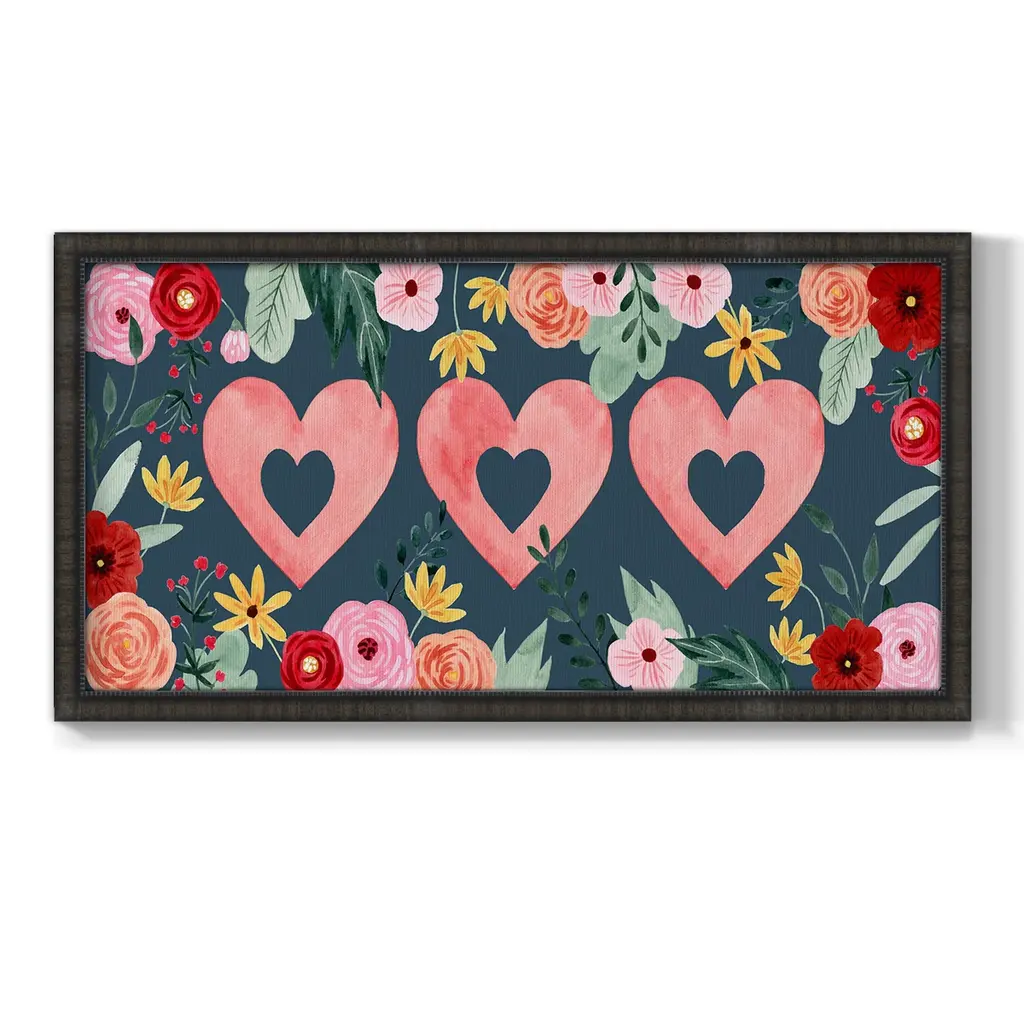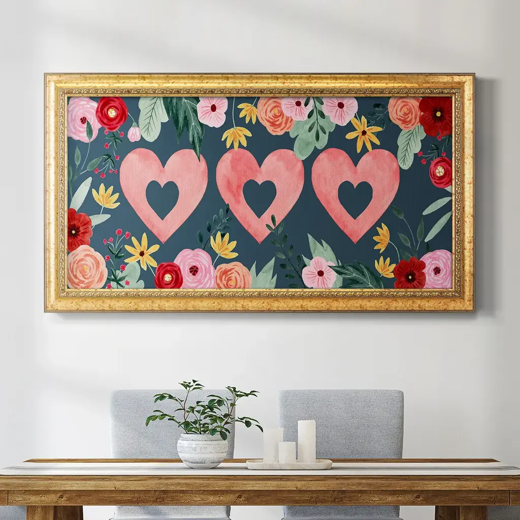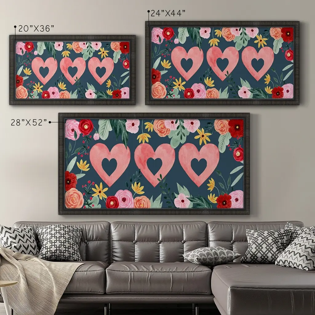 Sweet Hearts Collection D Premium Framed Canvas- Ready to Hang A Premium Framed Canvas created to last. Framed in distressed wood and available in an array of sizes and colors Featuring a beveled a solid wood stretcher bar, each piece comes ready to hand 3 SIZES AVAILABLE 21''X37'' - Overall Size 25''X45'' - Overall Size 29''x53'' - Overall Size Each piece is made to order. Each piece comes with hanging hardware. Made in the USA Ready to Hang Giclee Paper Print Acrylic Glass Beveled Matt Board