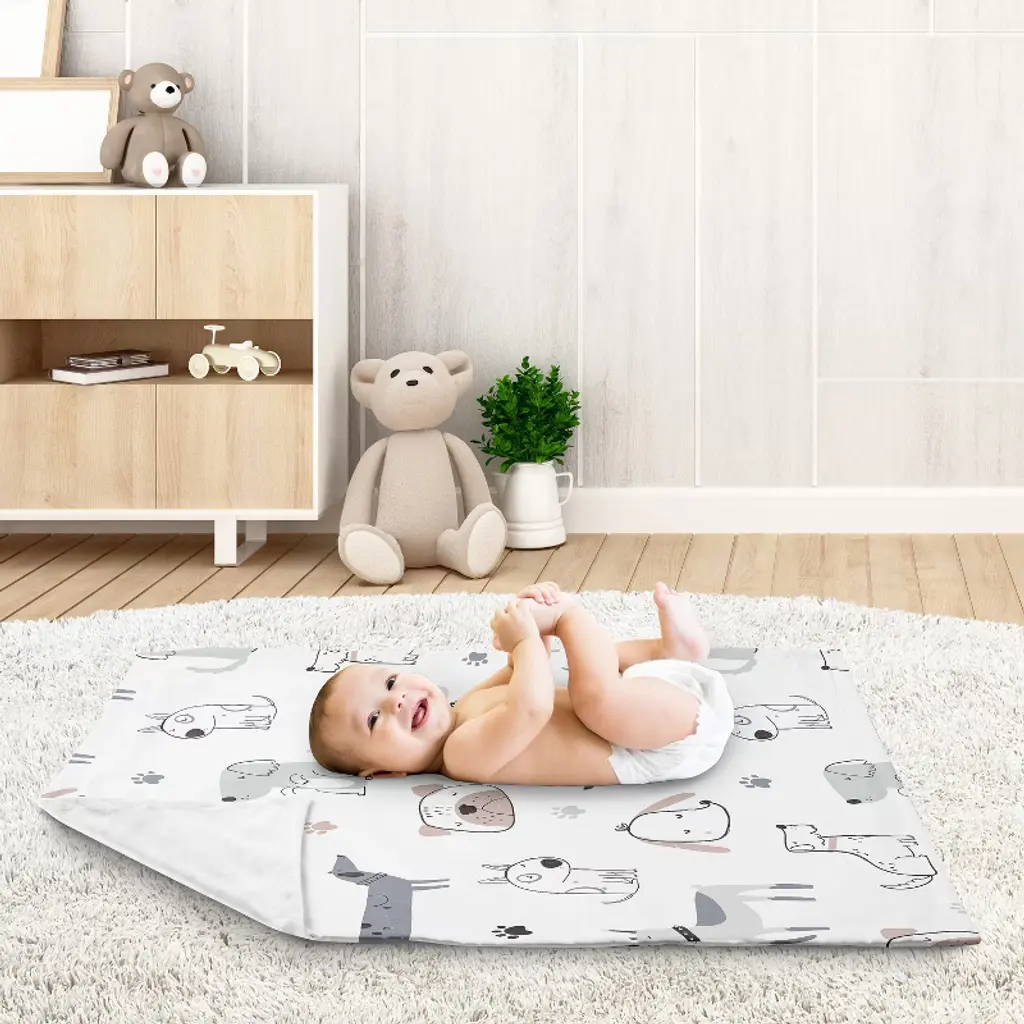 Cartoon Puppy Collection Sweet Jojo Designs Sweet Jojo Designs baby blankets are the perfect combination of soft and cozy that makes for a must have newborn essential. Designed with comfortable and snuggly fabrics, this baby receiving security blanket features exclusive patterns and designs that complete the look of your nursery theme. Use this versatile swaddle blanket as a security blanket or receiving blanket, or tummy time floor blanket in your infant nursery, play room, home theater, guest room, apartment, den, bathroom, home office, bed room, classroom, family room, kids bed room, foyer, gaming room, kitchen, livingroom or mud room. Take your travel blanket on the go as a stroller cover, nursing cover or shopping cart cover to make sure your little one is prepared wherever you go! All parents know the importance of a baby lovey – don’t forget to pick up an extra back up kids blanket so your bundle of joy can still have their soft baby blanket even when it needs to be washed. Pair your minky baby blanket with your favorite Sweet Jojo Designs collections and coordinate with our crib bedding sets, crib sheets, swaddles, playmats and baby room decor accessories. Use a soft minky blanket for comfort in the car, stroller blanket, nursing cover, shopping cart cover or as a travel blanket to guarantee your infant is always wrapped in love and warmth! Bring a little piece of home on road trips, vacations, or holidays for your little one by bringing their portable lovey blanket to ensure they feel safe and secure. Keep an extra plush baby blanket at home in every room so you are never without it! Keep it always within reach in your nursery, gaming room, living room, class room, childrens bedroom, den, bathroom, foyer, playroom, home office, apartment, guest room, home theater, family room, kitchen or mud room for comfort wherever you are. This blanket is also great to bring to preschool, daycare, or grandparents house. Makes the perfect gift to coordinate with Sweet Jojo Designs nursery bedding, changing pad covers, nursing pillow covers, wall decor, window treatments, nursery room decoration accessories and laundry hampers. Include It in your baby shower gift basket in the place of tissue paper or gender reveal presents or add to your baby gift registry to ensure you have all you need to complete your Sweet Jojo Designs baby bed room look. Blanket is designed using a grey taupe and blue modern watercolor puppy bulldog wiener doggy pet puppies dog and paw print brushed microfiber print and reverses to soft white minky.