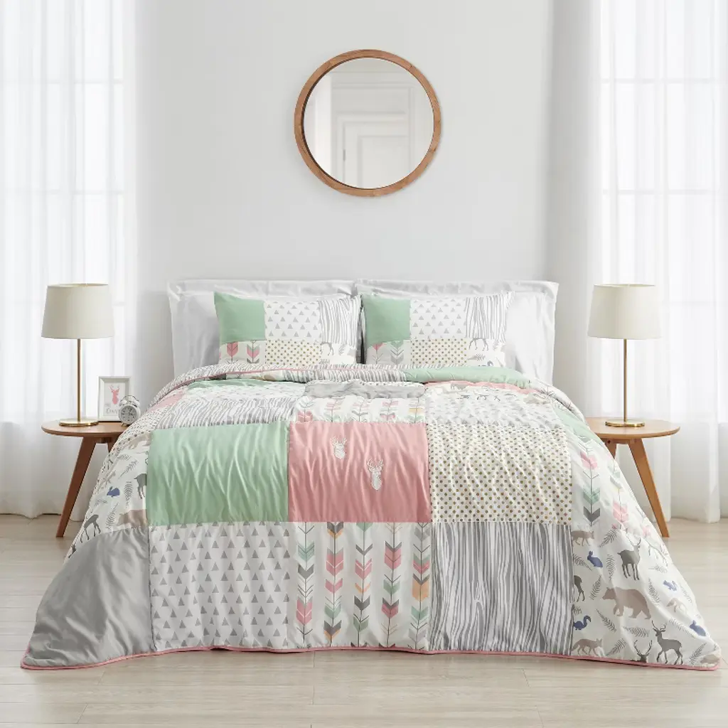 Woodsy Coral, Mint and Grey Collection full/queen bedding set by Sweet Jojo Designs has everything you'll need to create a cozy bedroom in your home. This set includes 1 Full / Queen Comforter and 2 Standard Shams and is made with exclusive and thoughtfully curated Sweet Jojo Designs fabrics and designs. Sweet Jojo Designs creates various coordinating room accessories for all of their bedding sets including hampers, wall decor, sheets and window treatments (These items not included). Features a coral pink, mint green and grey woodland deer stag animals print.