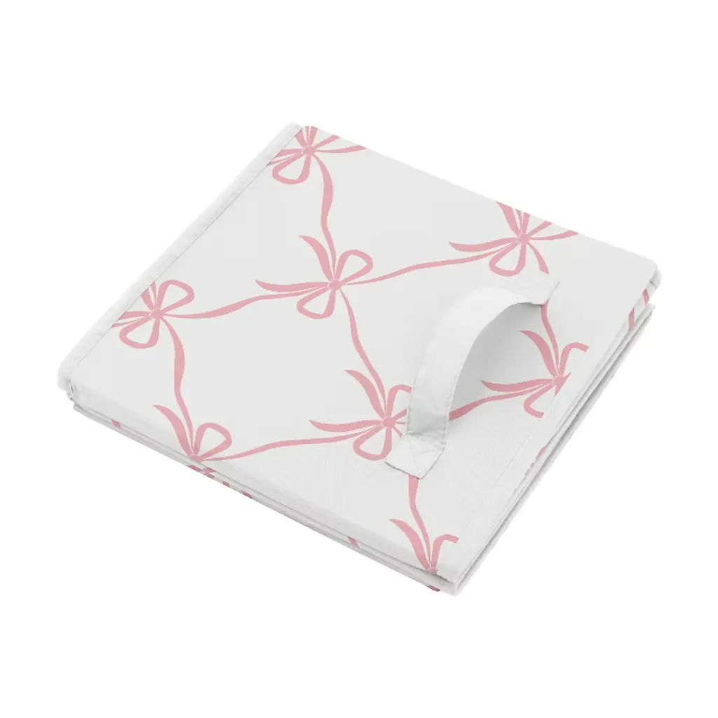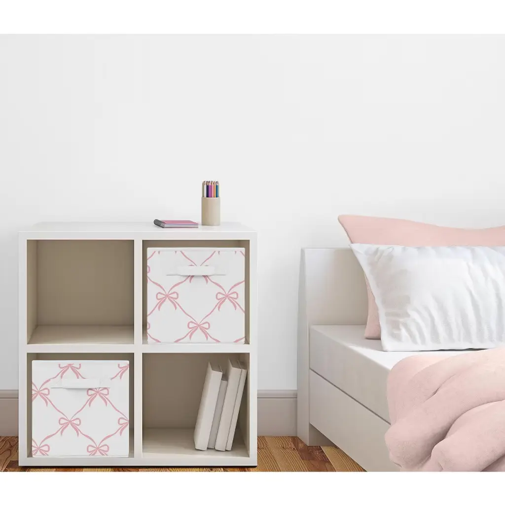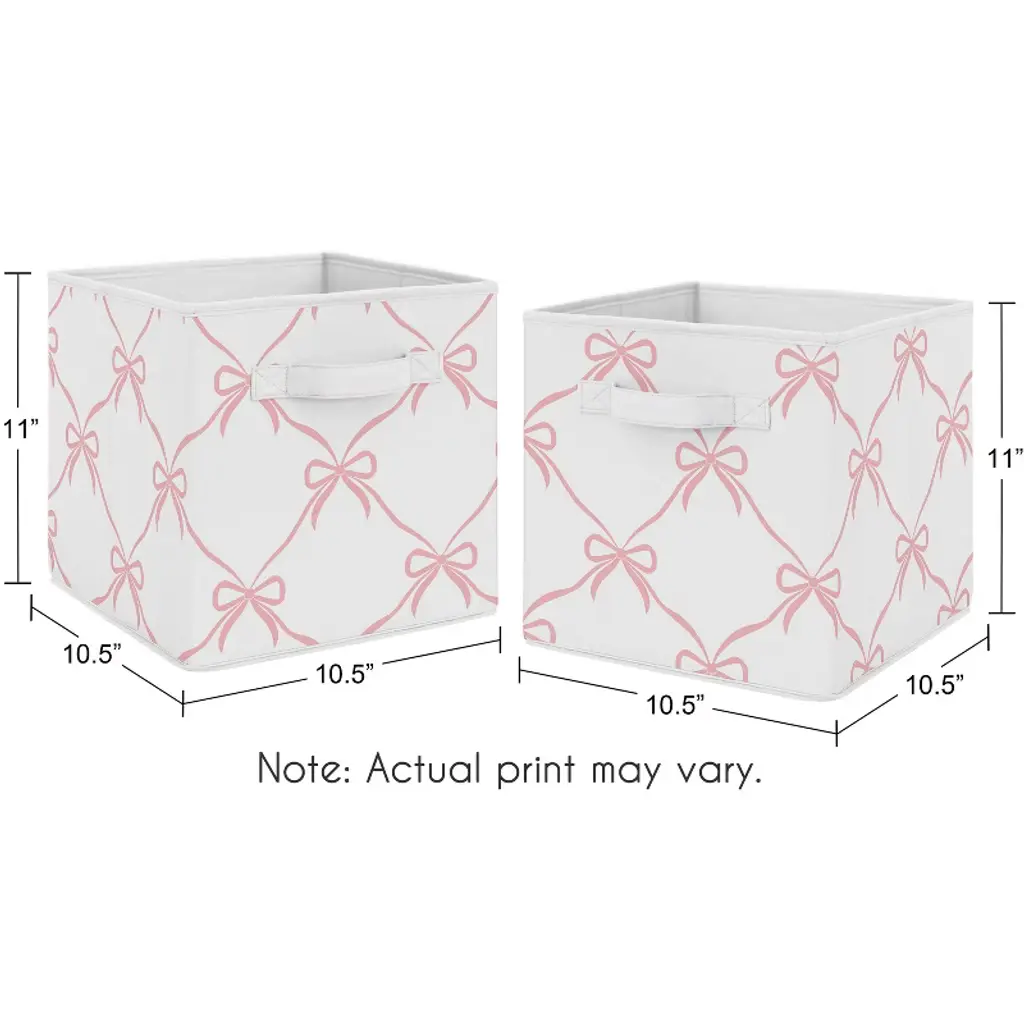Ballerina and Ballet Bows Collection Sweet Jojo Designs storage bins are the perfect combination of decor and storage to bring a stylish update to your baby nursery, bed room, classroom, closet, kitchen, livingroom, college dorm, den, family room, foyer, gaming room, guest room, home gym, home office, apartment, attic, basement, bathroom, home theater, kids bed room, mud room, pantry, play room or garage. With the variety of designs available, any room for baby, children, teens, college students, or adults will be easily upgraded with these simple storage solutions. These collapsible fabric storage cubes feature exclusive patterns and prints to create a convenient and chic set of decorative bins to use for any occasion or age. Declutter your home with organizer bins to help meet your organization needs for all common household items such as small plush toys, stuffed animals, baby clothing, shoes, wash cloths, books, kids clothes, household clutter and more. Use this set of two foldable storage cubes in most standard cubby-hole shelving furniture or as stand-alone bins. Made from a flexible and foldable material, simply fold flat and store for easy space saving storage when not in use. Pair your set of organizing bins with your favorite Sweet Jojo Designs collections and coordinate with our crib bedding sets, twin or queen bed sets, window valances, and room decor accessories to give you a complete look for any room in your home. Use storage bins with handles to organize and store all your household clutter while also serving as decorative room decor. These storage baskets for organizing can be placed in your nursery, closet, college dorm, den, family room, foyer, apartment, attic, basement, bathroom, bedroom, classroom, gaming room, guest room, home gym, home office, home theater, kids bed room, kitchen, living room, mud room, pantry, play room or garage. Kid friendly storage solutions are perfect for holding your children’s items, newborn essentials, or general home goods such as blankets, pillows, Montessori educational supplies, toys, sheets, books, linens, towels, clothing, dog toys and more. Makes the perfect gift to coordinate with Sweet Jojo Designs nursery bedding, crib sheets, changing pad covers, nursing pillow covers, duvets, sheet sets, window treatments, wall decor, and home decor accessories. It can also double as a functional decorative alternative to paper boxes, gift bags or wrapping paper by holding your birthday presents, baby shower gifts and gender reveal presents within the decorative bins. These brushed microfiber fabric storage bins feature an exclusive design of a blush pink and white shabby chic dancer princess bows print with white cotton fabric handle.