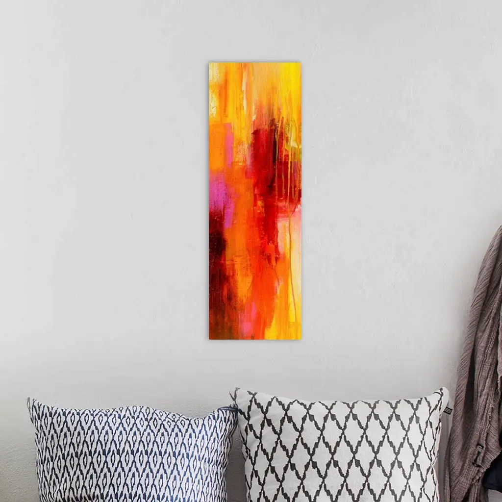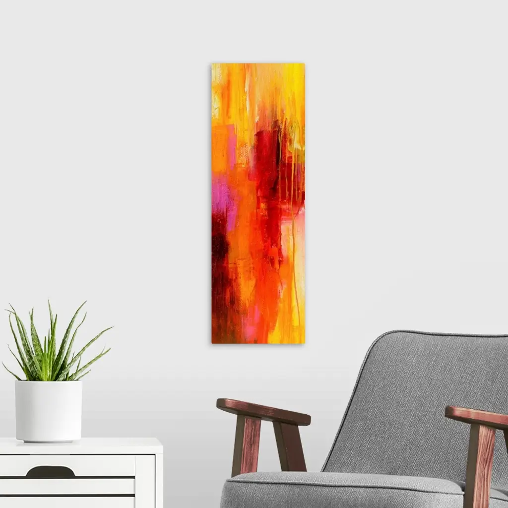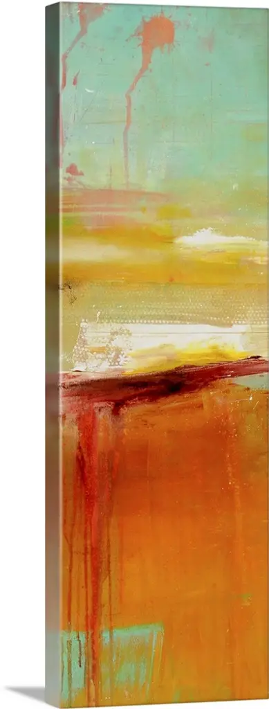 Contemporary vertical panoramic painting of colorful linear brush strokes and running paint.