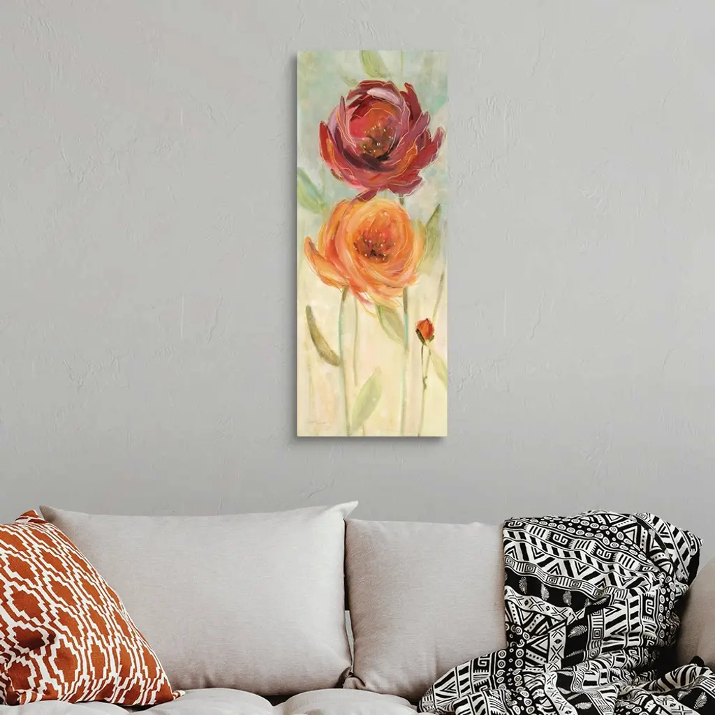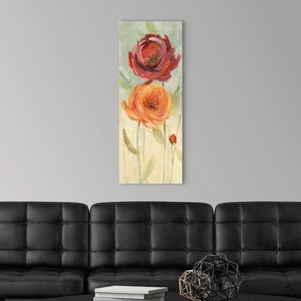 Large panel painting of an orange and a red poppy flower with gold highlights on a light earth toned background.