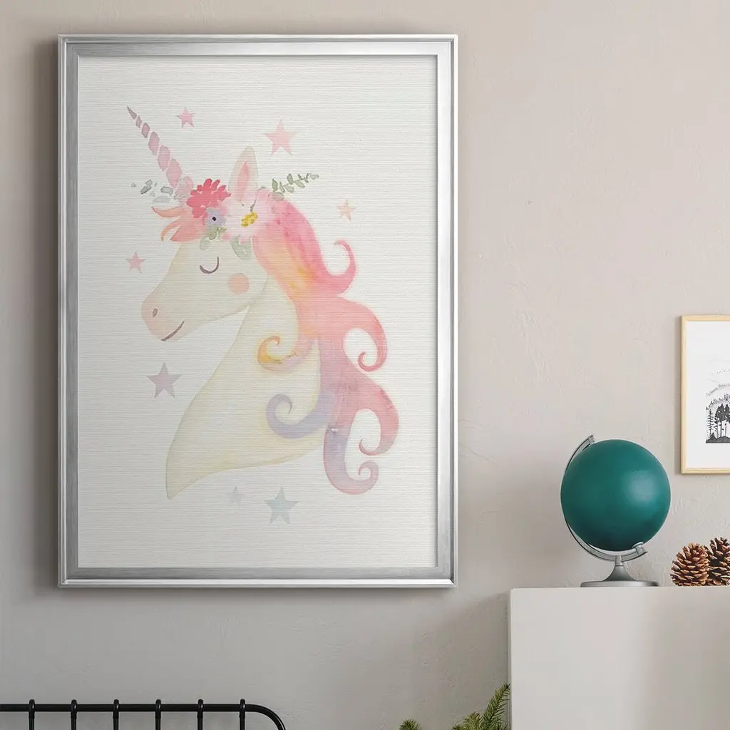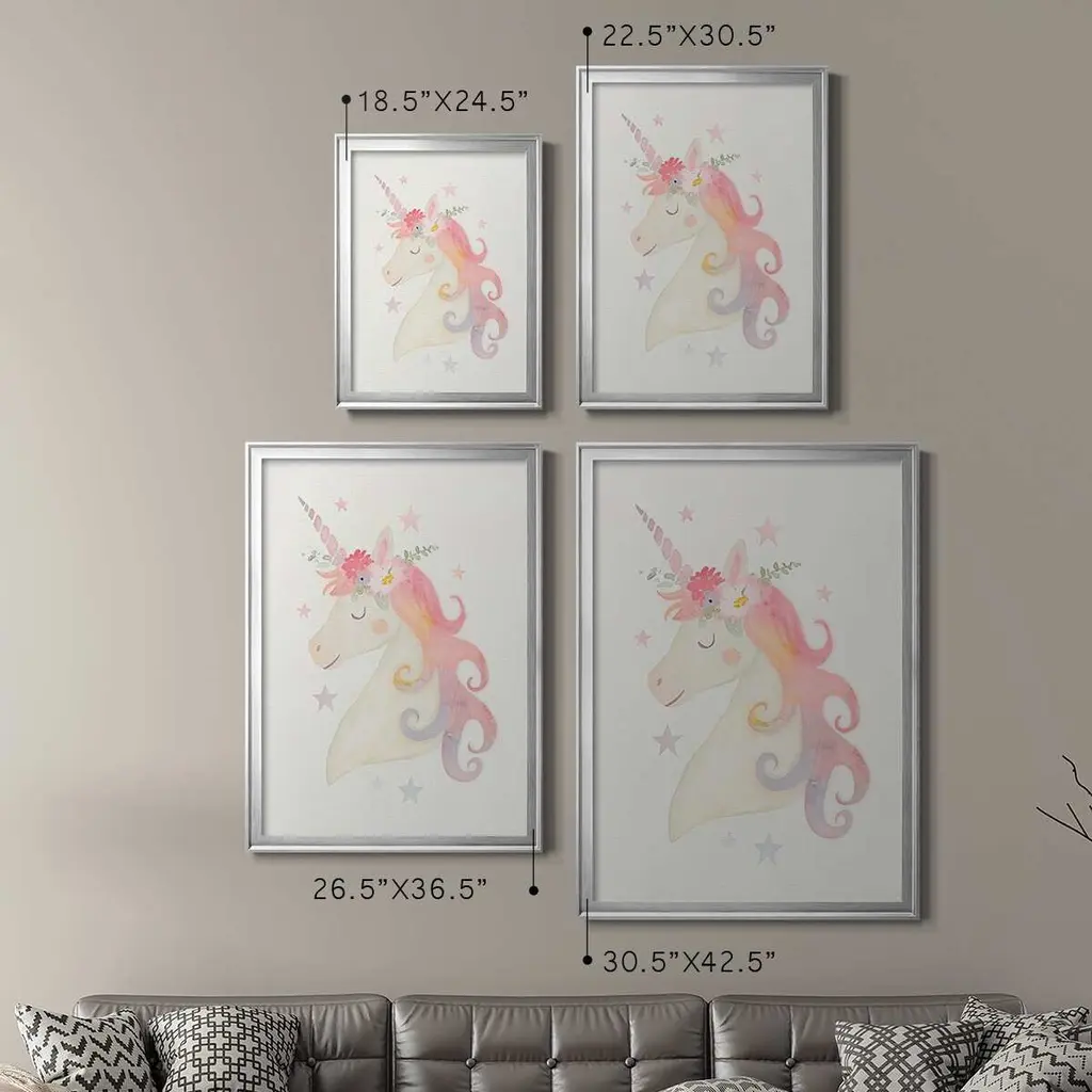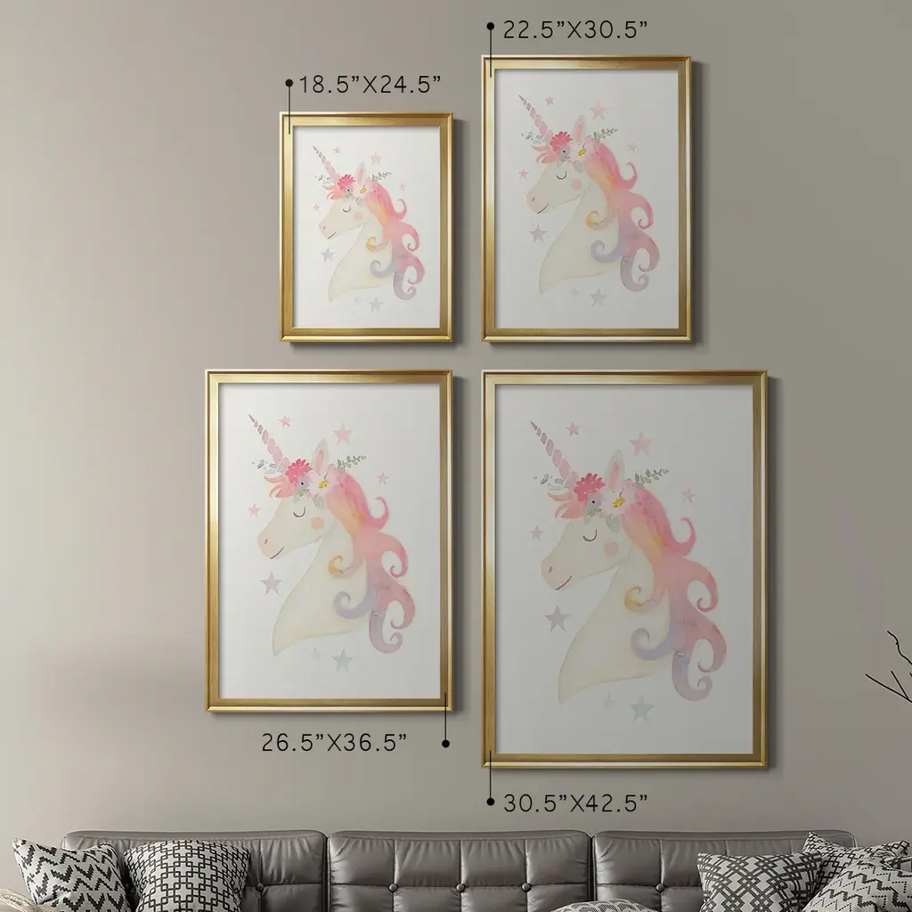 Sweet Unicorn I Premium Framed Print - Ready to Hang A Premium Framed Print created to last. Framed in distressed wood and available in an array of sizes and colors Featuring a beveled a solid wood stretcher bar, each piece comes ready to hand 4 SIZES AVAILABLE 30.5''X42.5'' - Overall Size 26.5'X36.5'' - Overall Size 22.5''x30.5'' - Overall Size 18.5''x24.5'' - Overall Size Each piece is made to order. Each piece comes with hanging hardware. Made in the USA Ready to Hang