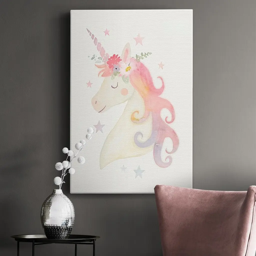 Sweet Unicorn I Premium Gallery Wrapped Canvas - Ready to Hang A premium hand stretched gallery wrapped canvas print created to last. Featuring a beveled a solid wood stretcher bar, each piece comes ready to hand 6 SIZES AVAILABLE 8''X12'' - Overall Size 12''X18'' - Overall Size 18''X27'' - Overall Size 24''x36'' - Overall Size 32''x48'' - Overall Size 40''x60'' - Overall Size Each piece is made to order. Built to Last Each piece comes ready to hang Solid wood stretcher Fade and Water resistant Made domestically