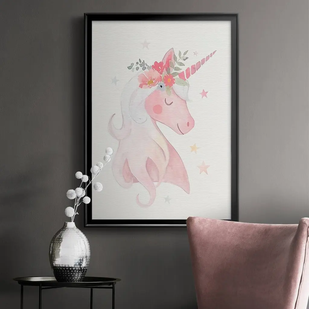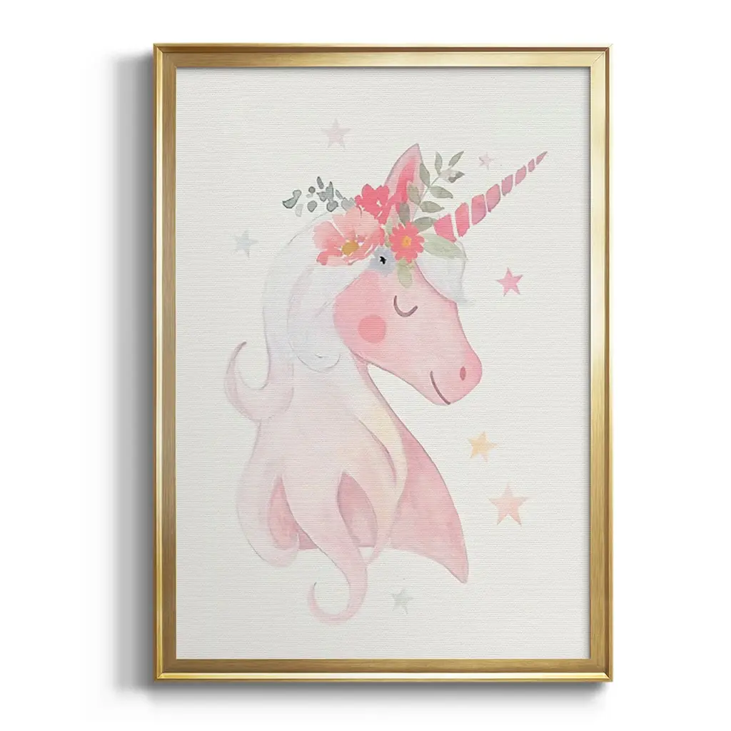 Sweet Unicorn II Premium Framed Print - Ready to Hang A Premium Framed Print created to last. Framed in distressed wood and available in an array of sizes and colors Featuring a beveled a solid wood stretcher bar, each piece comes ready to hand 4 SIZES AVAILABLE 30.5''X42.5'' - Overall Size 26.5'X36.5'' - Overall Size 22.5''x30.5'' - Overall Size 18.5''x24.5'' - Overall Size Each piece is made to order. Each piece comes with hanging hardware. Made in the USA Ready to Hang