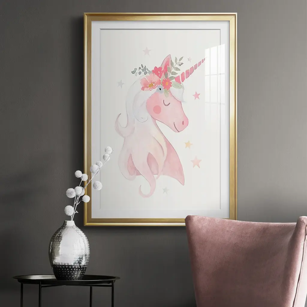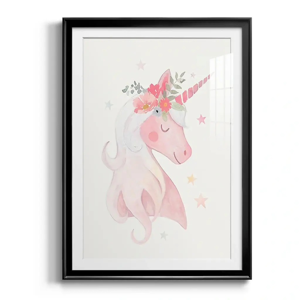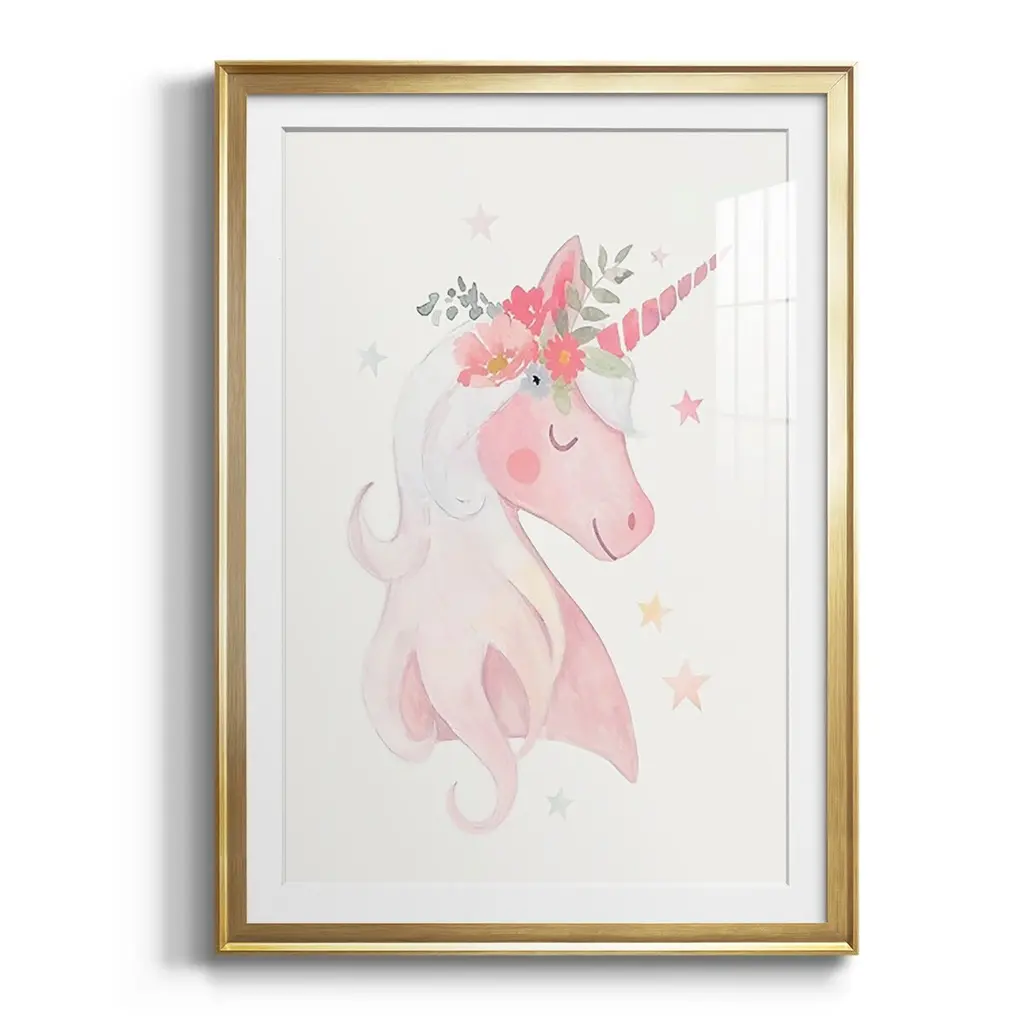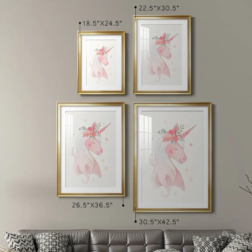 Sweet Unicorn II Premium Framed Print - Ready to Hang A Premium Framed Print created to last. Framed in distressed wood and available in an array of sizes and colors Featuring a beveled a solid wood stretcher bar, each piece comes ready to hand 4 SIZES AVAILABLE 30.5''X42.5'' - Overall Size 26.5'X36.5'' - Overall Size 22.5''x30.5'' - Overall Size 18.5''x24.5'' - Overall Size Each piece is made to order. Each piece comes with hanging hardware. Made in the USA Ready to Hang Giclee Paper Print Acrylic Glass Beveled Matt Board