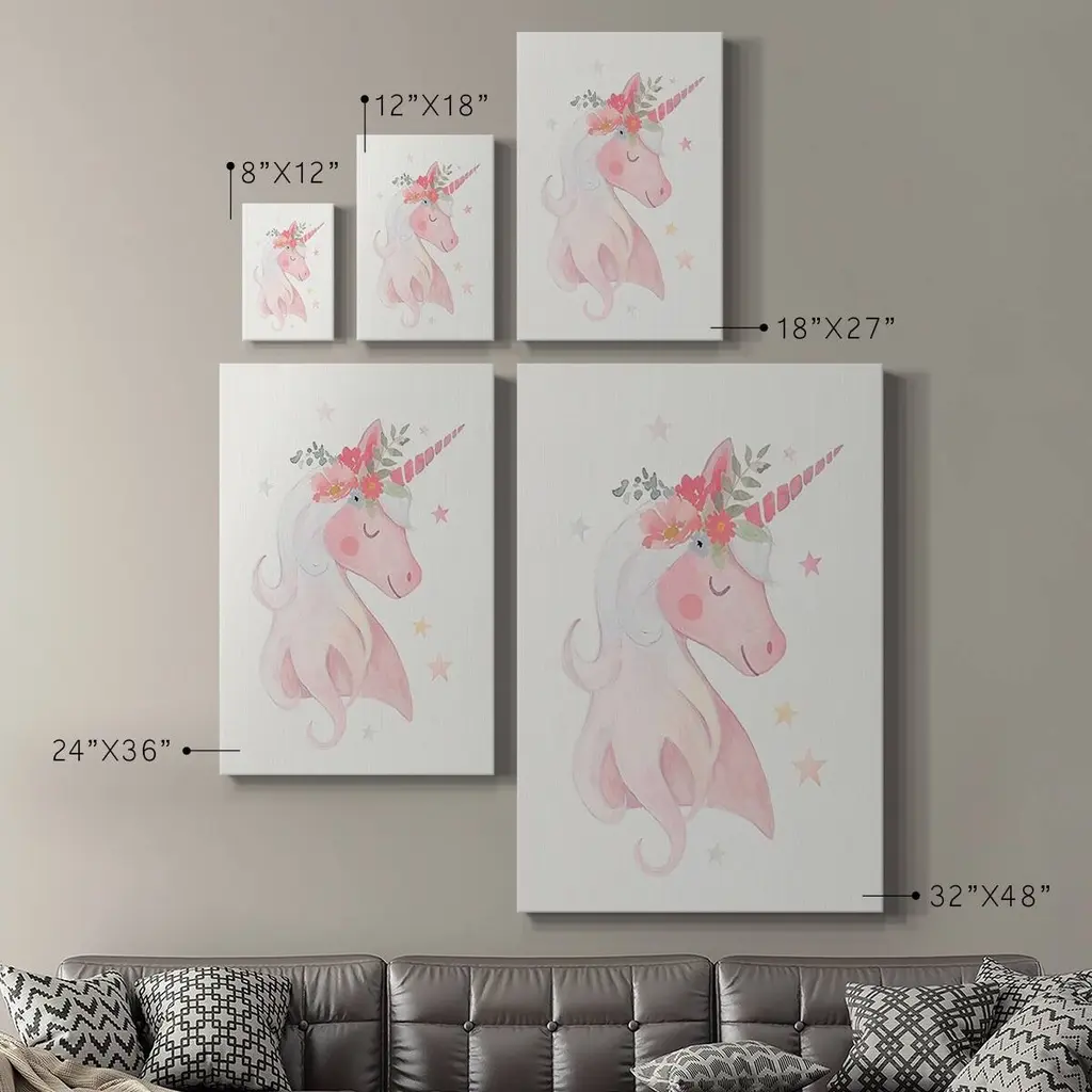 Sweet Unicorn II Premium Gallery Wrapped Canvas - Ready to Hang A premium hand stretched gallery wrapped canvas print created to last. Featuring a beveled a solid wood stretcher bar, each piece comes ready to hand 6 SIZES AVAILABLE 8''X12'' - Overall Size 12''X18'' - Overall Size 18''X27'' - Overall Size 24''x36'' - Overall Size 32''x48'' - Overall Size 40''x60'' - Overall Size Each piece is made to order. Built to Last Each piece comes ready to hang Solid wood stretcher Fade and Water resistant Made domestically