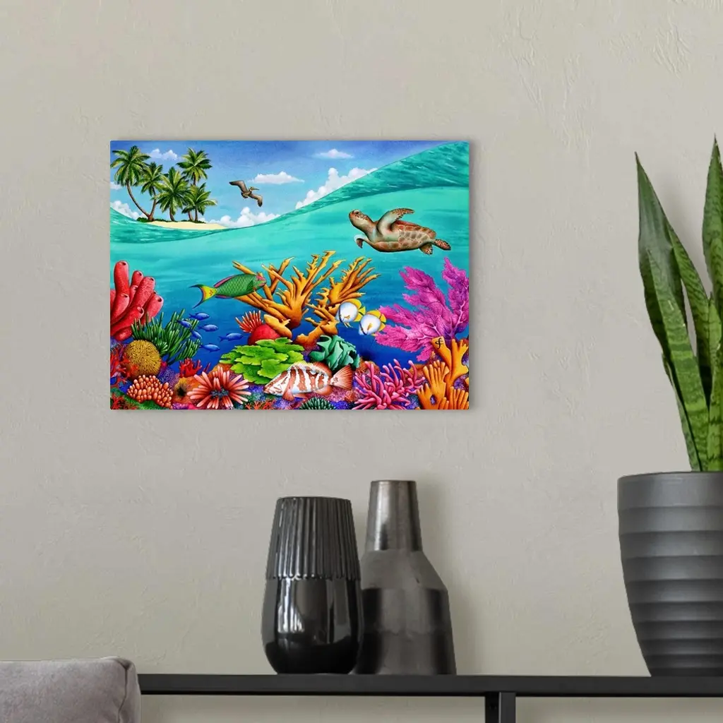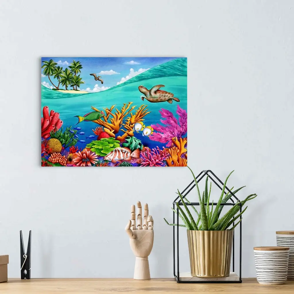 Tropical themed artwork using bright vivid colors to depict the flowers and animals of the environment.