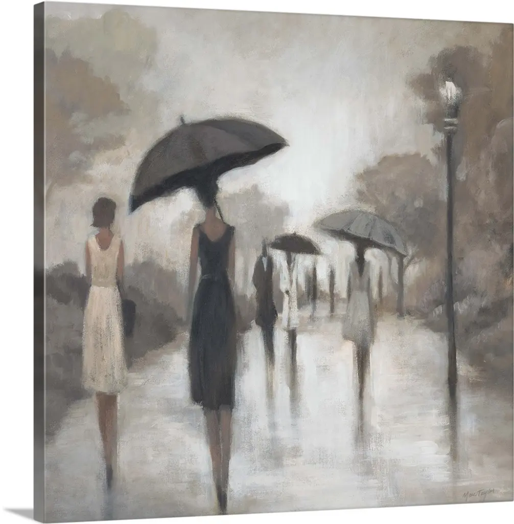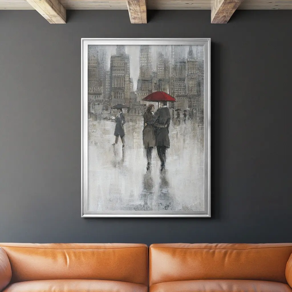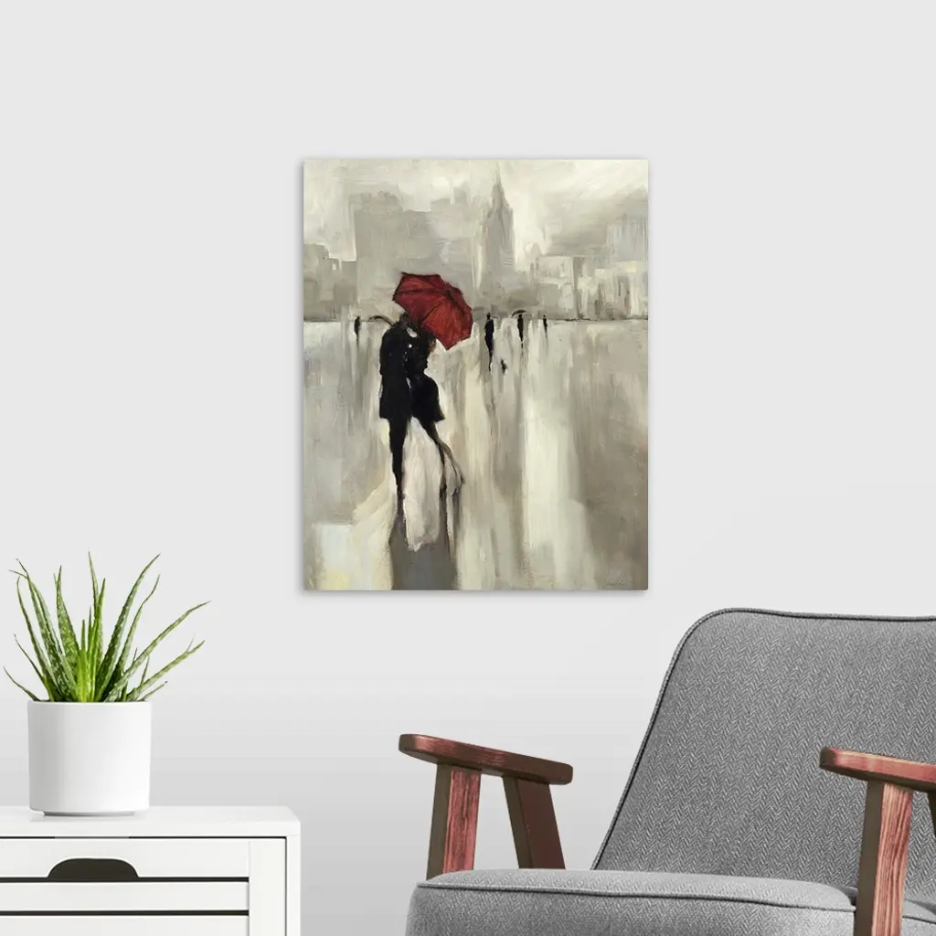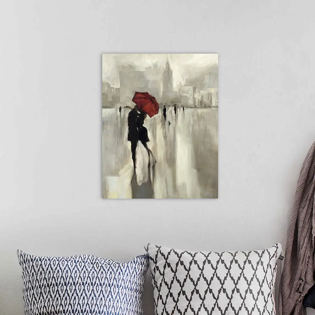 Contemporary home decor painting of a silhouetted people under a red umbrella in a loving embrace.