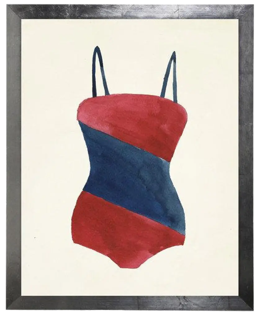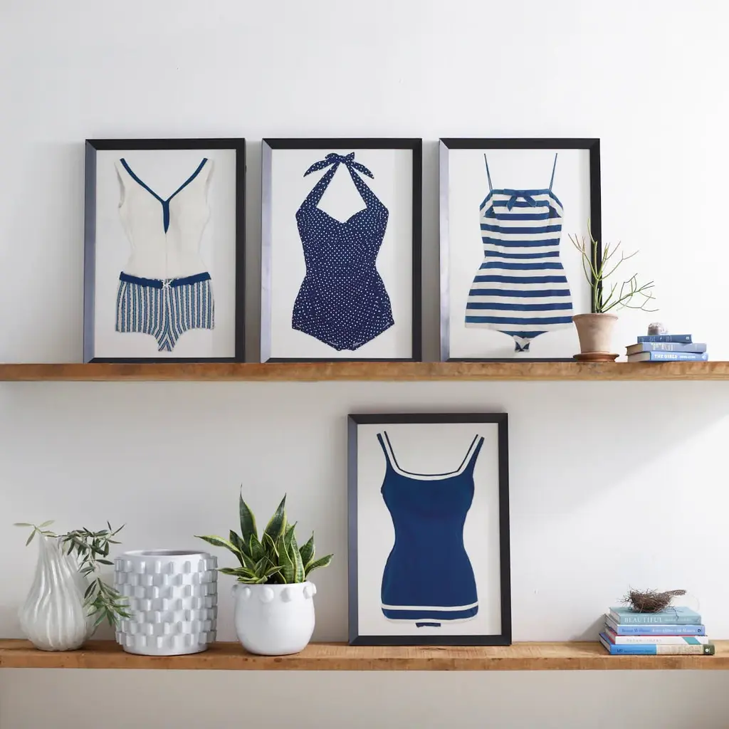 Vintage Deauville-style one-piece swimsuits in navy and white set the scene for coastal style with a splash of glamor. Giclee photographic prints add graphic interest and a whimsical humor. Hang singly or group the series for maximum impact.