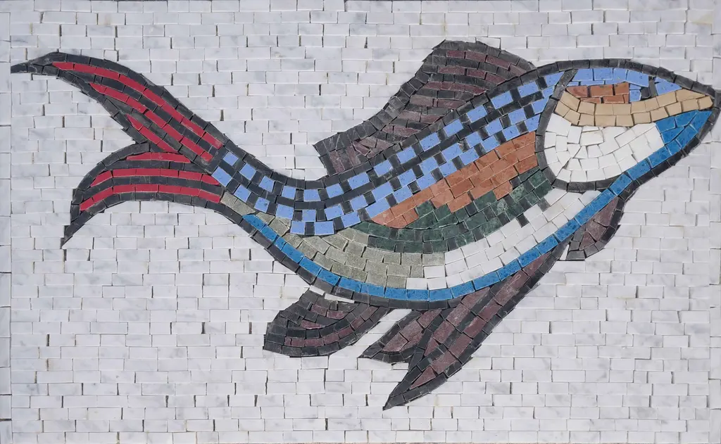 Introducing our Swimming Fish II Mosaic Design, a stunning handcrafted piece that brings the beauty of marine life into your space. This unique design features a captivating side view of a fish with its mouth open, showcasing intricate details that celebrate the artistry of mosaic craftsmanship. The fish is elegantly detailed with a sleek black tail and fins, adding a striking contrast that enhances its visual appeal.This exquisite fish mosaic is meticulously handmade from high-quality marble, ensuring durability and longevity. Its vibrant design is not only a feast for the eyes but also a versatile addition to your home decor. Whether you’re looking to elevate your bathroom, enhance your pool area, or bring a touch of nature to your indoor spaces, this fish mosaic is the perfect choice.The Swimming Fish II Mosaic Design seamlessly blends style and function, making it suitable for both indoor and outdoor settings. Imagine it as a focal point in your bathroom, where it can add a splash of creativity and color, or picture it adorning your garden or patio, where it can serve as a playful reminder of the underwater world.Perfect for those who appreciate unique art pieces, this fish mosaic can easily complement a variety of styles, from contemporary to classic. Its robust construction means it can withstand the elements, making it a delightful addition to any outdoor decor theme.Elevate your space with the exquisite craftsmanship and timeless design of the Swimming Fish II Mosaic Design. Embrace the charm of this fish mosaic and let it transform your home into a vibrant underwater oasis. Order yours today and make a statement in your decor!