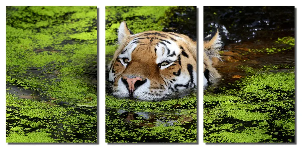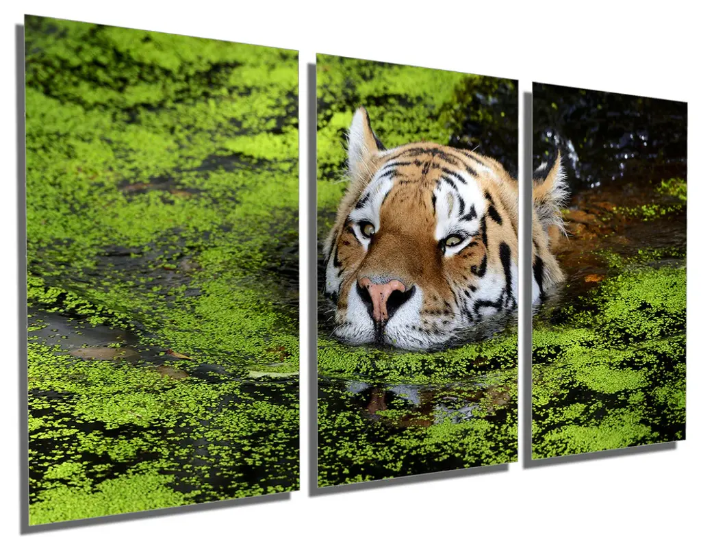 48"œ x 24"œ total size. Ready To Hang! (3 pieces - 16"œ x 24"œ each). 3 Panel Split (Triptych) Metal Print of a Swimming Tiger in a green pond. Modern metal wall art for home or office wall decor & interior design. Printed on Luxurious, HD aluminum glossy metal panels. Multi panel art.. HD aluminum panels. Metal print wall art. Includes Shadow Wall Mount on the back.• Aluminum Metal Wall Art• Made in USA• Ready to hang - No assembly required• Shadow mount hardware on the back• 0.045"œ thick HD Aluminum Panels• Scratch resistant, glossy finish• Superb color clarity, luxurious prints• Epson printing process• For indoor or moisture rich environment use• Easy to clean. Gently wipe with microfiber cloth.