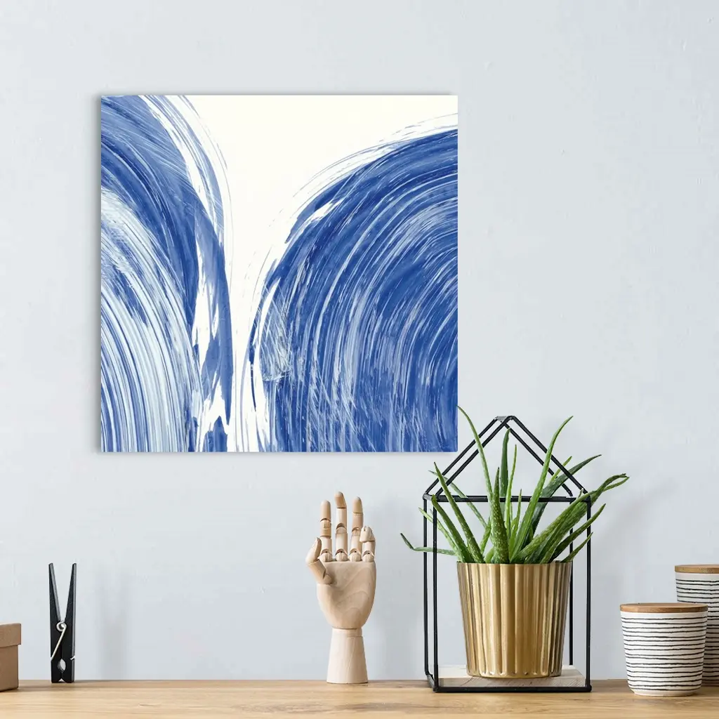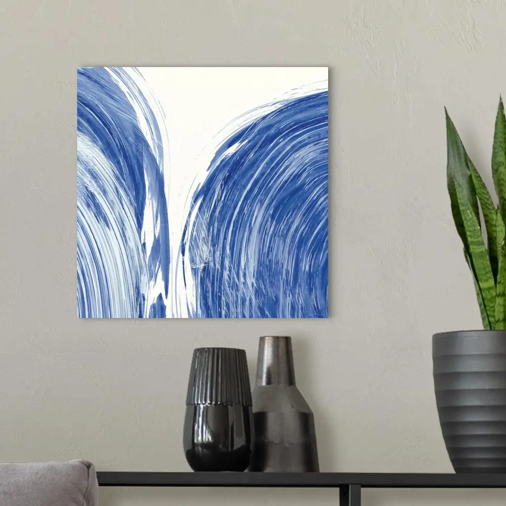 Large square abstract painting of bold blue brush strokes in curved lines.
