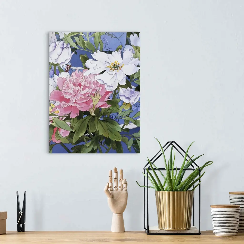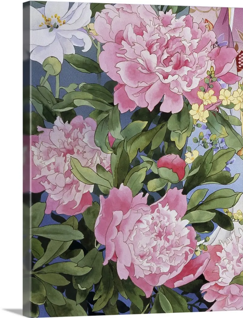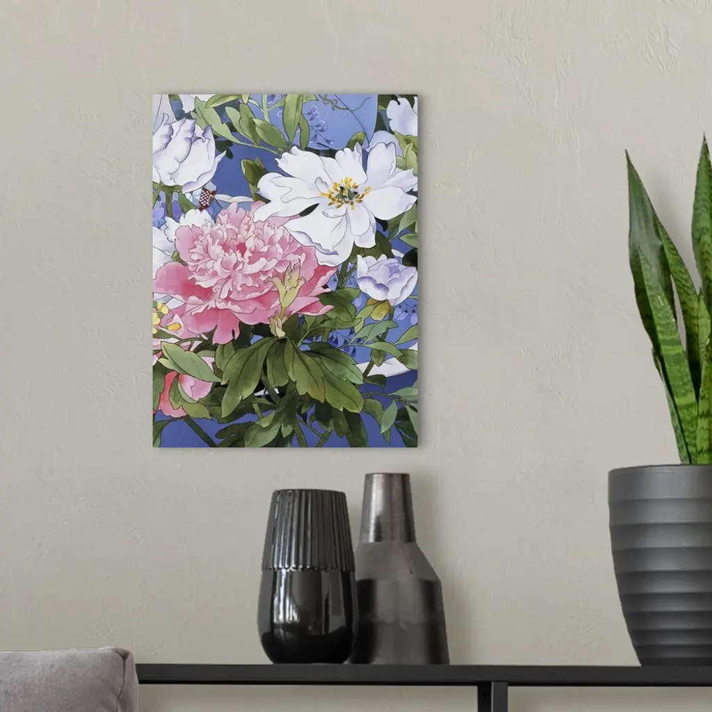 Contemporary colorful and lavish looking Asian artwork of beautiful pink and white flowers.