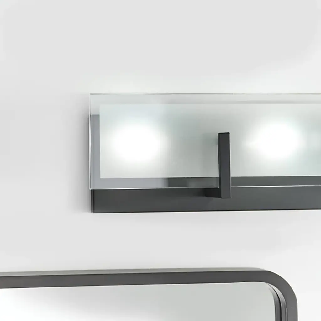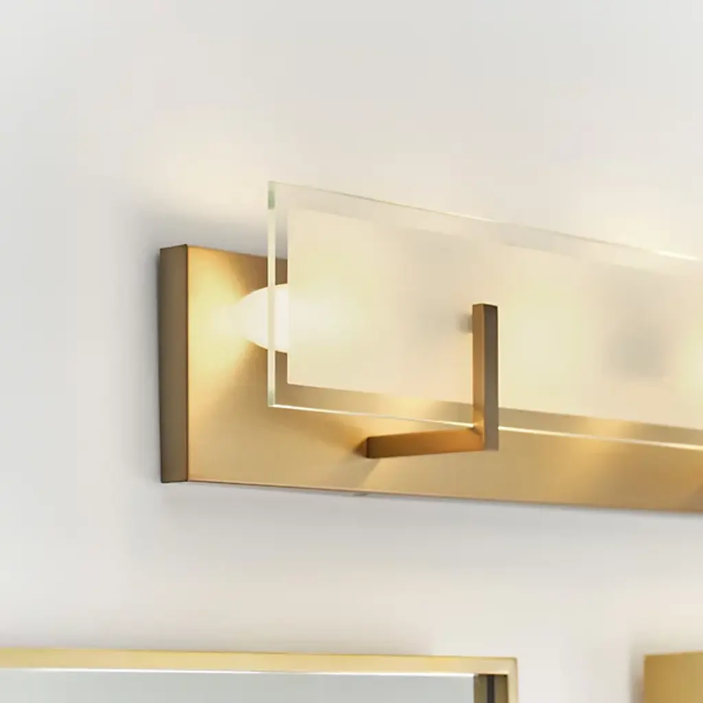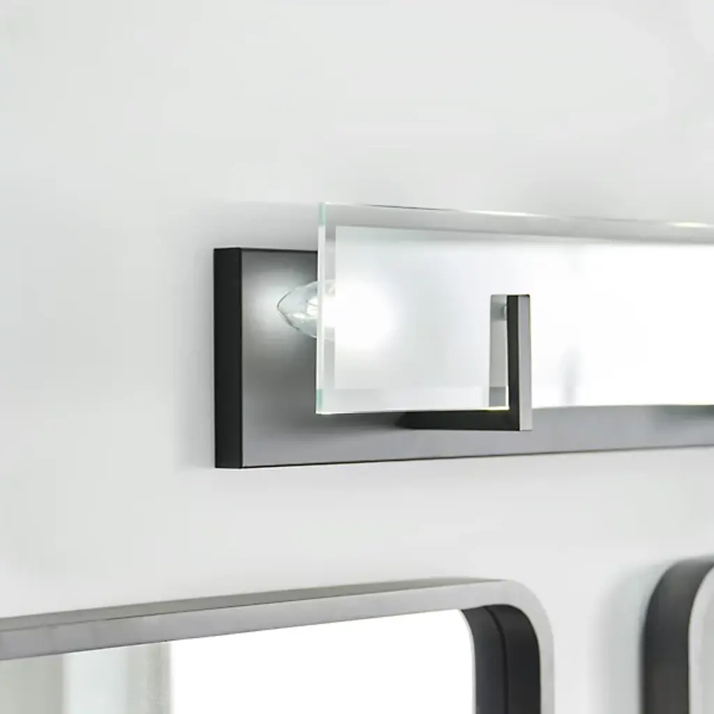 Brighten bathrooms and other interior locations with the stylish Syll Vanity Light from Visual Comfort Studio, formerly known as Sea Gull Lighting, Anchored by a rectangular metal wall plate with a smooth surface, angular brackets arc up and out from the plate’s lower half to hold a flat plate of glass in front of several damp-listed candelabra-style sockets. Most of the diffuser is satin-etched, with a clouded surface that gentles direct glare from the lamping, while clear edges allow notes of brightness from the sides.