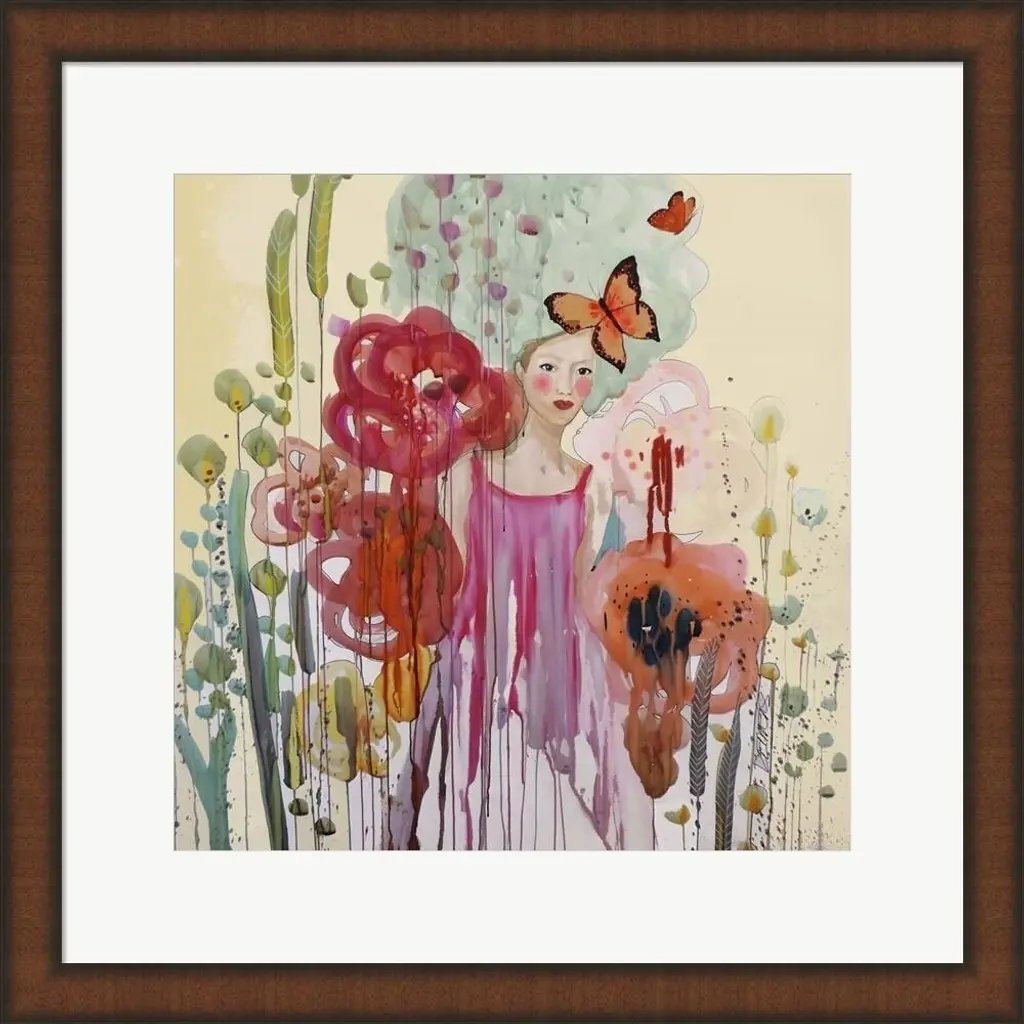 Les Temps Presents by Sylvie Demers is a high quality piece of framed artwork. The finished size of this piece is 20.75" X 20.75". It has a Slim Teak with Espresso Brown Edges frame, is single matted and finished with high quality Acrylic Plexiglass.
