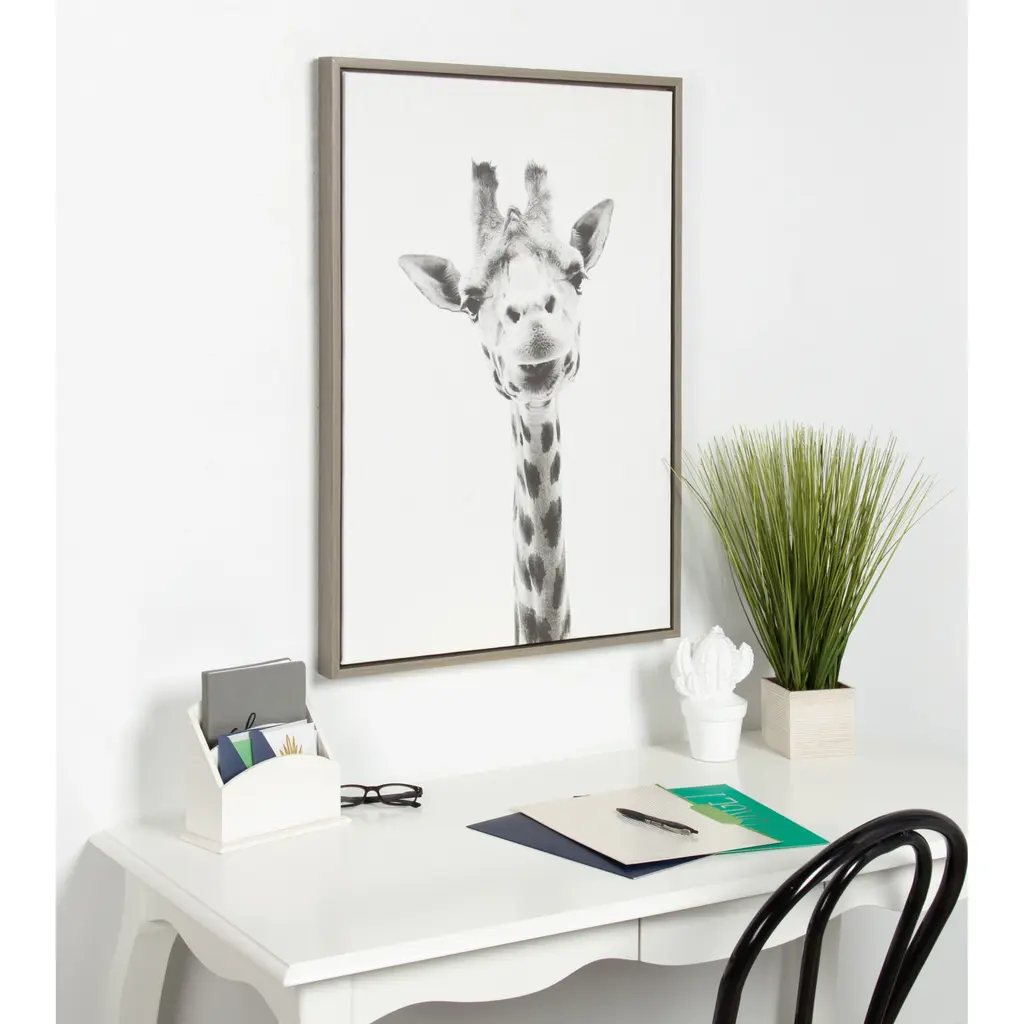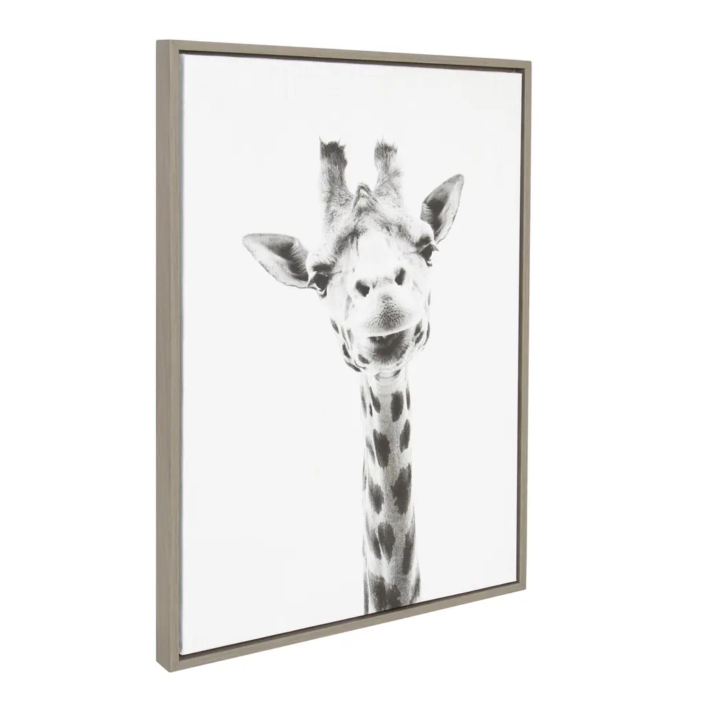 Encourage a smile or two when you hang this fun framed canvas wall art in your home. This 'Sylvie Giraffe' print adds instant whimsy and a touch of humor to your decor with its monochrome depiction of a sweet giraffe against a field of stark white. A beautiful woodgrain frame accentuates the artwork for a standout presentation.FRAMED CANVAS PRINT: A decorative black and white giraffe portrait is printed on framed gallery wrapped canvas.EFFORTLESS HANGING: The metal sawtooth hangers come attached on the inset MDF back for easy wall display.STATEMENT SIZE: The frame is a lightweight material with a light gray wood-grain look. The framed canvas display dimensions are 33 inches high by 23 inches across by 1.6 inches deep.FRAMED IN WISCONSIN: Gallery wrapped canvas is printed and framed in Waunakee, Wisconsin, USA of domestic and imported parts.AUTHENTIC: Prints are part of the Simon Te Tai collection 2017 Simon Te Tai Prints.