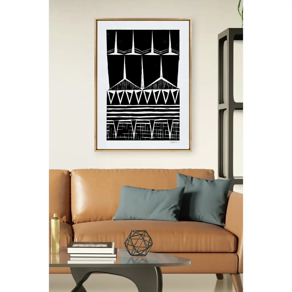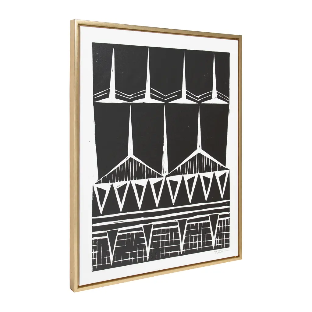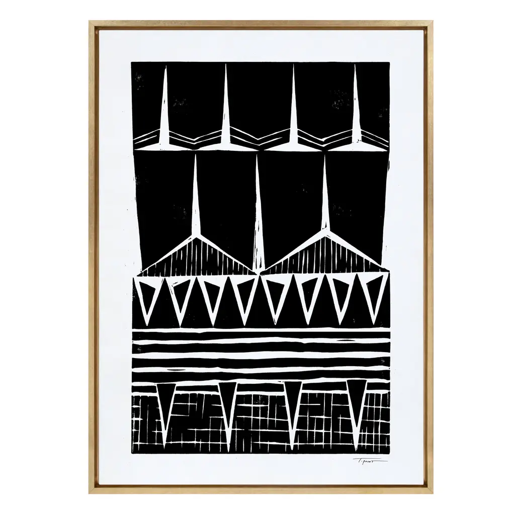 This print features a bold and dramatic tribal inspired design with strong geometric shapes using a striking black and white color scheme. The artists create their print from an original hand-carved block that is then inked and printed to powerful result. Framed in a fashionable gold, this lovely, modern design is the perfect wall art to add to your home decor collection. Printed and framed in the USA in Waunakee, Wisconsin, this framed floating canvas art will be a pleasure to look at every day in your living room, bedroom, entryway, or any room in the home. Printed on gallery wrapped canvas and framed with a gold lightweight polystyrene frame, it has two hangers already attached to the natural wood colored MDF back for easy wall display. The outer dimensions are 36 inches tall by 28 inches wide by 1.6 inches deep. Print Name: "Modern Tribal Block Print" Artists Biography: Statement Goods, (Toni Point and Alysia Fields) is an art and design duo that met and became friends while studying architecture at Mississippi State University. Toni has been a full-time artist for seven years and works in a wide variety of mediums, including block-printing, watercolor, and ink. Alysia worked for years as a financial analyst but now puts her art and architecture background to use as a digital editor. She collaborates with Toni to create unique patterns, making digital designs and any graphic design needs of the studio. They both had a love for pattern and design and started their design studio called Statement Goods, located just outside of New Orleans.FRAMED CANVAS ART: A bold, black-and-white tribal inspired design makes up this powerful block print on framed gallery wrapped canvas. Print name: "Modern Tribal Block Print" by Statement Goods.EFFORTLESS HANGING: The metal sawtooth hangers come attached on the inset MDF back for easy wall display.PERFECT SIZE: The frame is a lightweight material with display dimensions of 36 inches tall x 28 inches wide and 1.6 inches deep.FRAMED IN WISCONSIN: Gallery wrapped canvas is printed and framed in Waunakee, Wisconsin, USA of domestic and imported parts.AUTHENTIC: Art print on canvas by ©2017 Statement Goods.