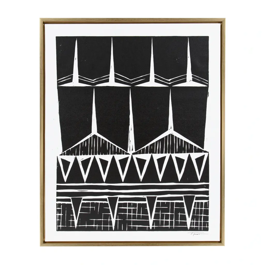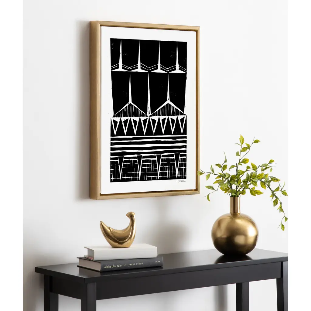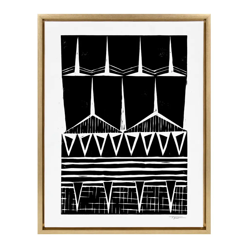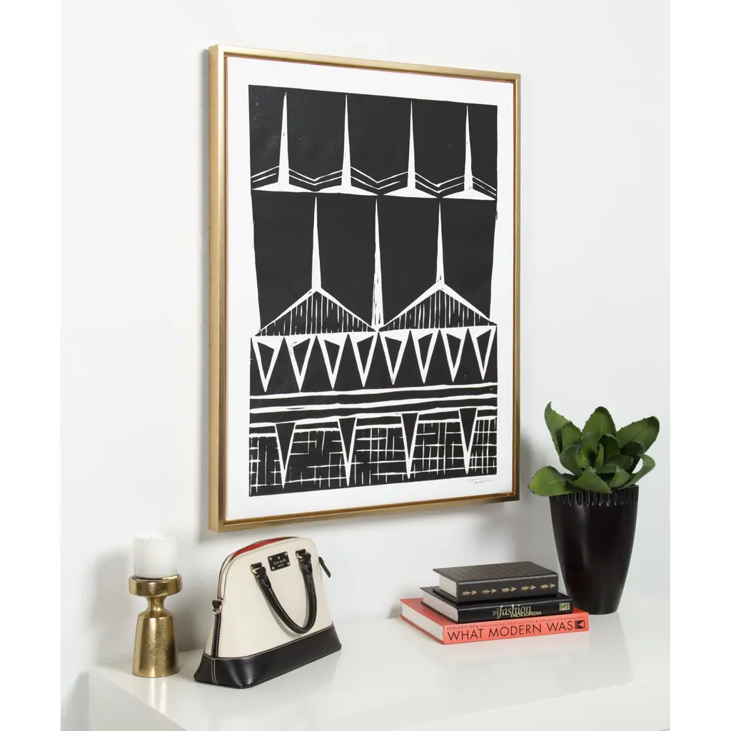 This print features a bold and dramatic tribal inspired design with strong geometric shapes using a striking black and white color scheme. The artists create their print from an original hand-carved block that is then inked and printed to powerful result. Framed in a fashionable gold, this lovely, modern design is the perfect wall art to add to your home decor collection. Printed and framed in the USA in Waunakee, Wisconsin, this framed floating canvas art will be a pleasure to look at every day in your living room, bedroom, entryway, or any room in the home. Printed on gallery wrapped canvas and framed with a gold lightweight polystyrene frame, it has two hangers already attached to the natural wood colored MDF back for easy wall display. The outer dimensions are 36 inches tall by 28 inches wide by 1.6 inches deep. Print Name: "Modern Tribal Block Print" Artists Biography: Statement Goods, (Toni Point and Alysia Fields) is an art and design duo that met and became friends while studying architecture at Mississippi State University. Toni has been a full-time artist for seven years and works in a wide variety of mediums, including block-printing, watercolor, and ink. Alysia worked for years as a financial analyst but now puts her art and architecture background to use as a digital editor. She collaborates with Toni to create unique patterns, making digital designs and any graphic design needs of the studio. They both had a love for pattern and design and started their design studio called Statement Goods, located just outside of New Orleans.FRAMED CANVAS ART: A bold, black-and-white tribal inspired design makes up this powerful block print on framed gallery wrapped canvas. Print name: "Modern Tribal Block Print" by Statement Goods.EFFORTLESS HANGING: The metal sawtooth hangers come attached on the inset MDF back for easy wall display.PERFECT SIZE: The frame is a lightweight material with display dimensions of 36 inches tall x 28 inches wide and 1.6 inches deep.FRAMED IN WISCONSIN: Gallery wrapped canvas is printed and framed in Waunakee, Wisconsin, USA of domestic and imported parts.AUTHENTIC: Art print on canvas by ©2017 Statement Goods.