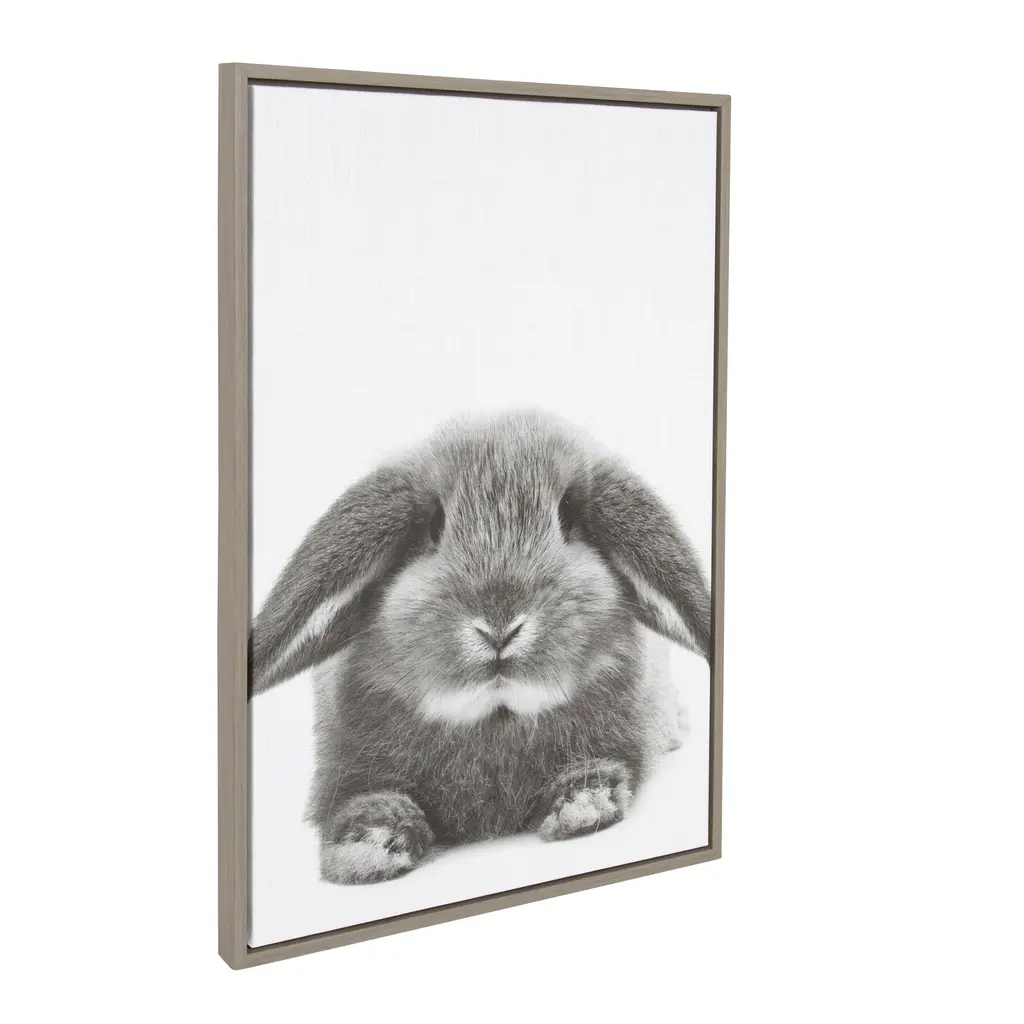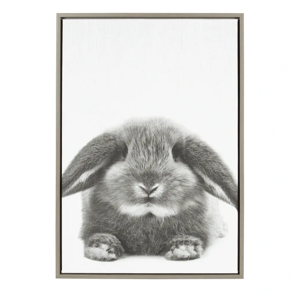 Place a statement piece to encourage conversation in your home with this Sylvie Rabbit by Simon Te Tai wall art. Featuring a grey and white color palette and complementary finished frame, this wall art of a silky, soft rabbit brings a modern look into any room. The photograph is printed on canvas for long-lasting durability.FRAMED CANVAS PRINT: A decorative black and white rabbit portrait is printed on framed gallery wrapped canvas. Print name: "Rabbit" by Simon Te Tai.EFFORTLESS HANGING: The metal sawtooth hangers come attached on the inset MDF back for easy wall display.STATEMENT SIZE: The frame is made of a lightweight material. The framed canvas display dimensions are 33 inches high by 23 inches across by 1.6 inches deep.FRAMED IN WISCONSIN: Gallery wrapped canvas is printed and framed in Waunakee, Wisconsin, USA of domestic and imported parts.AUTHENTIC: Prints are part of the Simon Te Tai collection 2017 Simon Te Tai Prints.