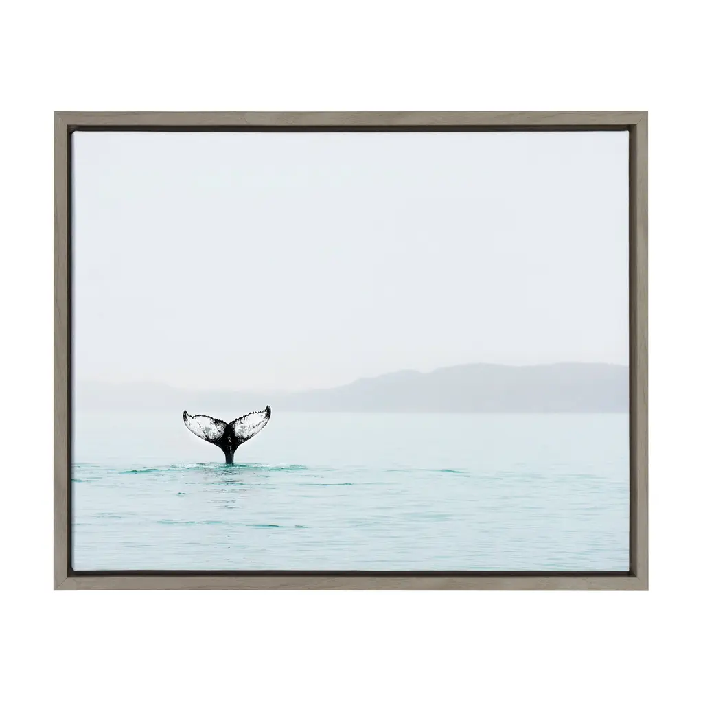 This stunning digital print perfectly captures the moment just before the whale's tail is submerged in the ocean. Printed and framed in the USA in Waunakee, Wisconsin, this framed floating canvas art will be a pleasure to look at every day in your living room, bedroom, nursery, or any room in the home. Printed on gallery wrapped canvas and framed with a lightweight polystyrene frame, this colorful wall art has two hangers already attached to the natural wood colored MDF back for easy wall display. The outer dimensions are 24 inches tall by 18 inches wide by 1.6 inches deep. Print Name: "Whale Tail" Artist Biography: Amy Peterson is a graphic designer and digital artist who lives and works in Northern California. She started her artistic career at an early age and later perfected her craft as a digital artist while working as a production designer in many of San Francisco's technical, creative agencies. Art has always been Amy's first love, and she is in her highest "happy place" when she is busy creating colorful and uplifting digital art. Good coffee and music are essential in Amy's creative world, and she is passionate about creating work that brings about feelings of joy and good vibes!