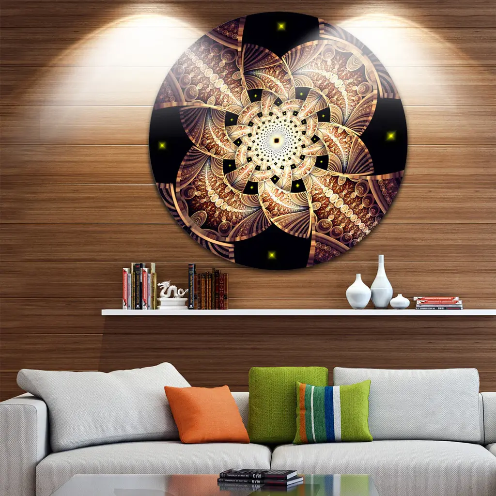 Bring Contemporary Abstraction to your home with this large Circle Metal wall art. This Symmetrical Yellow Brown Fractal Flower Metal Artwork makes it the focal point of any room or office. - White Gloss Coating ensures colors are extra vibrant with light reflection.- Aluminum grade Sheet Metal with 1 inch mounting frame on the back giving the illusion that the artwork is floating on the wall..- Mounting Brackets are included along with instructions.- High Quality Digital images are created directly into a glossy aluminum panel producing a stunning and captivating print into the glossy finish of the metal.- Water, Fire and Scratch resistant HD Aluminum panels.- Looks better than any photo paper and guaranteed to last at least 20 years- Easy to clean with a microfiber cloth. Colors are far superior to regular Canvas Art. - Easy to Hang