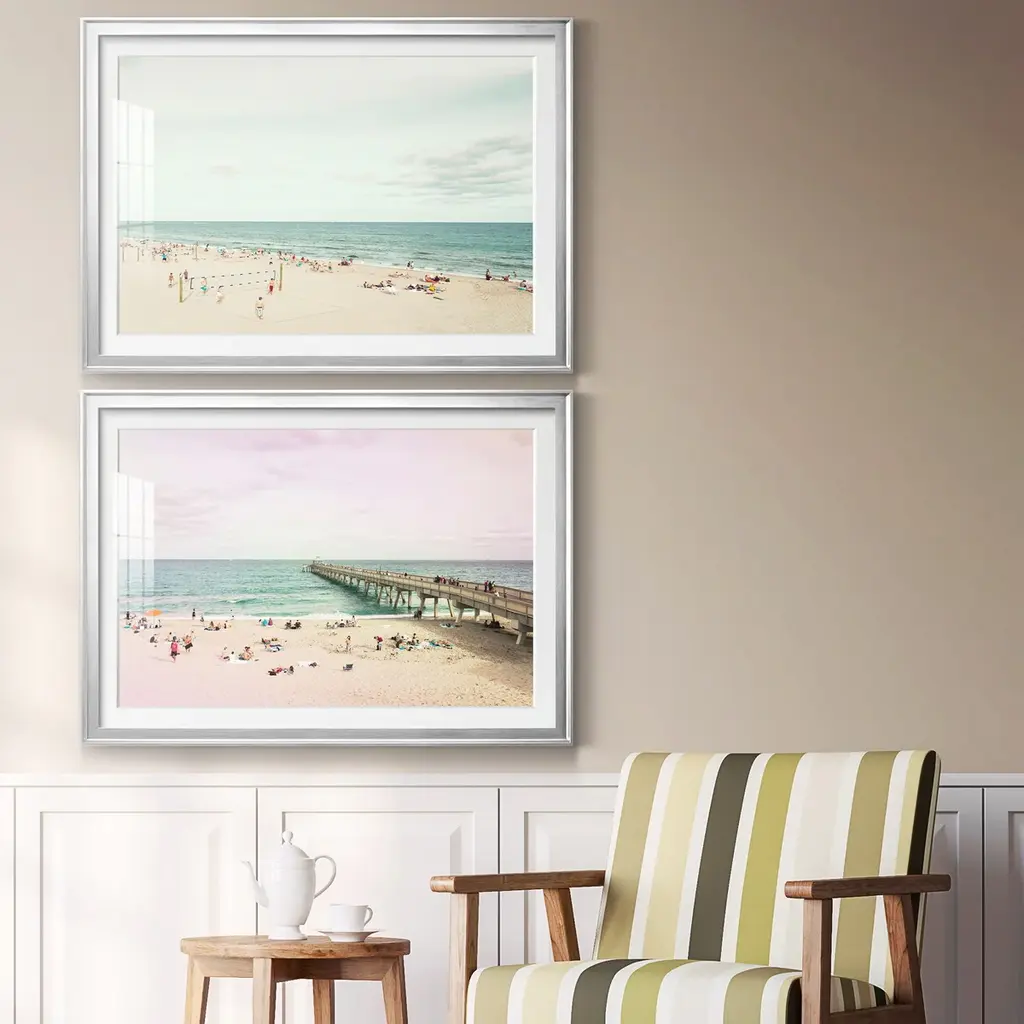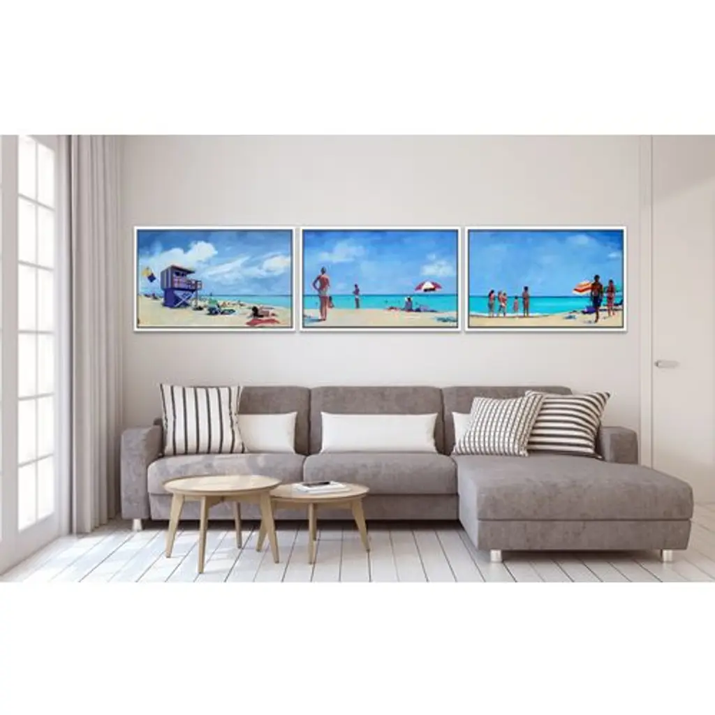 Seen first at One Kings Lane: Inspired by midcentury snapshots and film stills, this triptych from T. S. Harris perfectly captures the charm and spirit of summer days at the beach. Each piece in this set is printed on gallery-wrapped canvas, displayed in a white pine floater frame, and arrives ready to hang.The California artist T.S. Harris takes old black-and-white snapshots, often found at flea markets and yard sales, and lights them up with color. Her subjects are nostalgic, like her series on film stars of the 1940s and ’50s and her scenes of long leisurely summers. Harris makes each painting come to life by cropping into each scene, roughing up the paintwork, and weaving in a bright, light-filled palette.