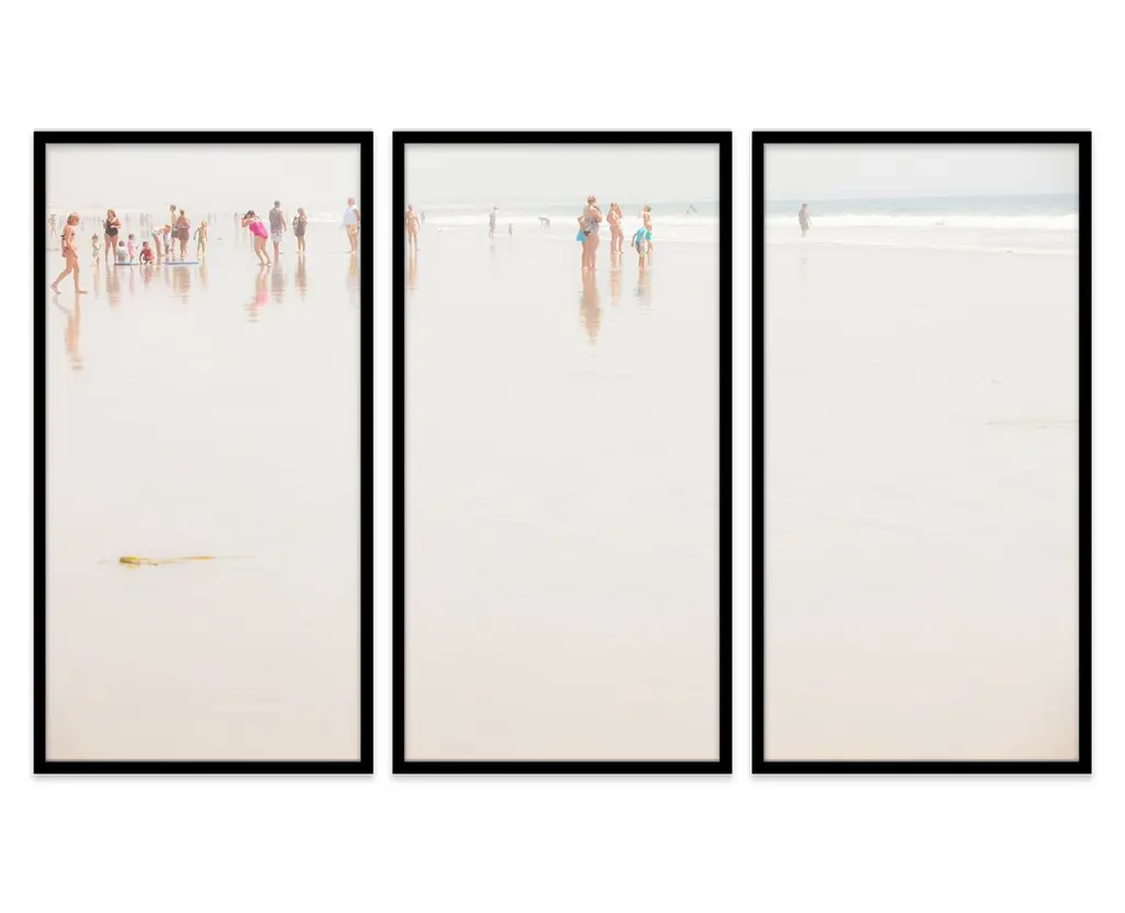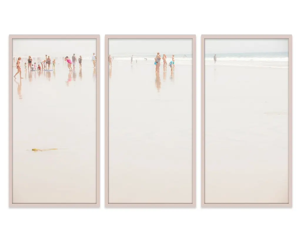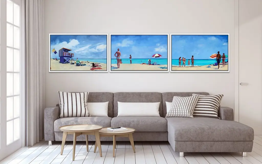 Seen first at One Kings Lane: Inspired by midcentury snapshots and film stills, this triptych from T. S. Harris perfectly captures the charm and spirit of summer days at the beach. Each piece in this set is printed on gallery-wrapped canvas, displayed in a white pine floater frame, and arrives ready to hang.The California artist T.S. Harris takes old black-and-white snapshots, often found at flea markets and yard sales, and lights them up with color. Her subjects are nostalgic, like her series on film stars of the 1940s and ’50s and her scenes of long leisurely summers. Harris makes each painting come to life by cropping into each scene, roughing up the paintwork, and weaving in a bright, light-filled palette.