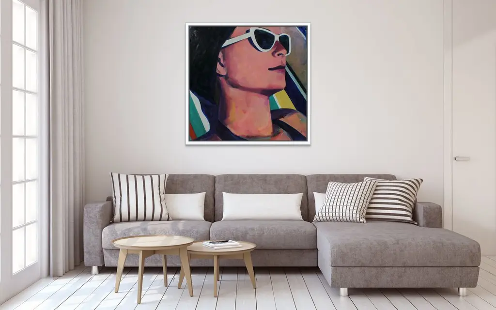 Inspired by midcentury snapshots and film stills, this piece from T. S. Harris features a woman in sunglasses on a carefree summer day. This work is printed on gallery-wrapped canvas, displayed in a white pine floater frame, and arrives ready to hang.The California artist T.S. Harris takes old black-and-white snapshots, often found at flea markets and yard sales, and lights them up with color. Her subjects are nostalgic, like her series on film stars of the 1940s and ’50s and her scenes of long leisurely summers. Harris makes each painting come to life by cropping into each scene, roughing up the paintwork, and weaving in a bright, light-filled palette.