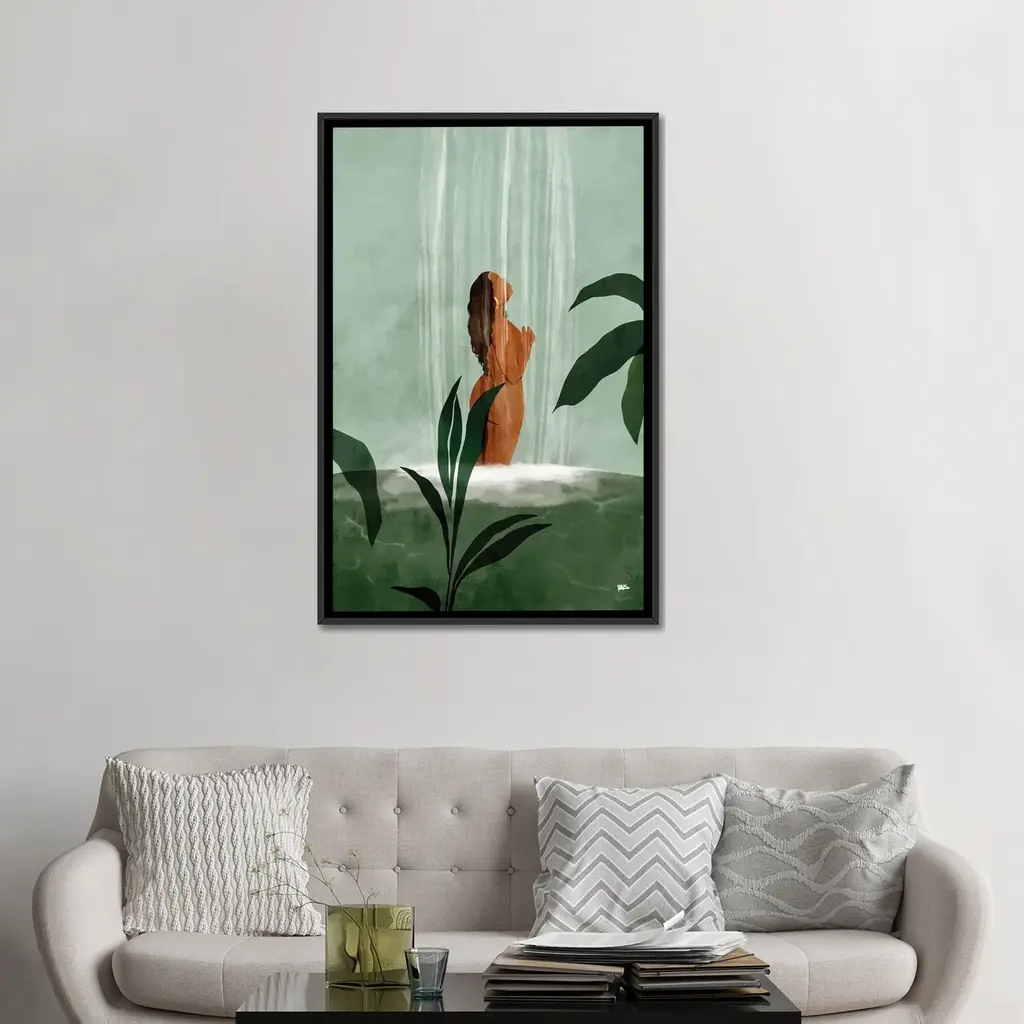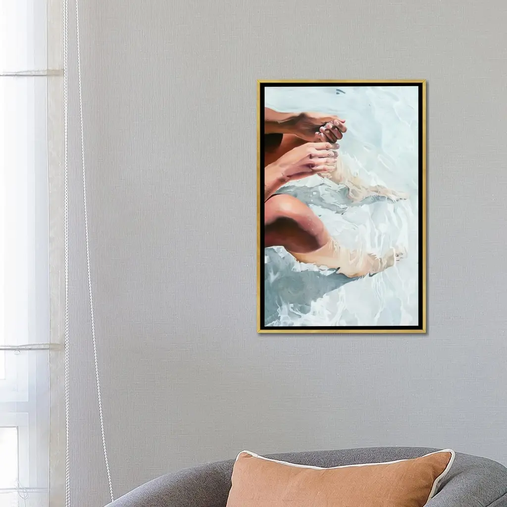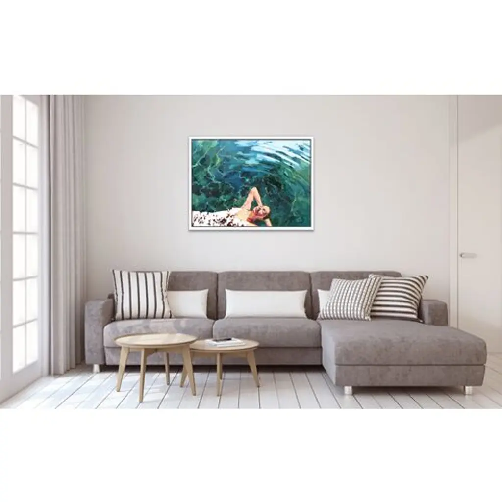 Inspired by midcentury snapshots and film stills, this piece from T. S. Harris depicts a woman floating in clear waters without a care in the world. This work is printed on gallery-wrapped canvas, displayed in a white pine floater frame, and arrives ready to hang.The California artist T.S. Harris takes old black-and-white snapshots, often found at flea markets and yard sales, and lights them up with color. Her subjects are nostalgic, like her series on film stars of the 1940s and ’50s and her scenes of long leisurely summers. Harris makes each painting come to life by cropping into each scene, roughing up the paintwork, and weaving in a bright, light-filled palette.