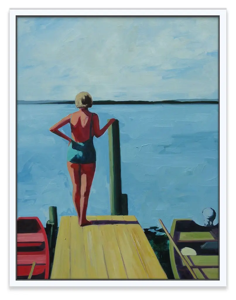 Seen first at One Kings Lane: Inspired by midcentury snapshots and film stills, this piece from T. S. Harris perfectly captures the charm and spirit of summer days gone by. This work is printed on gallery-wrapped canvas, displayed in a white pine floater frame, and arrives ready to hang.The California artist T.S. Harris takes old black-and-white snapshots, often found at flea markets and yard sales, and lights them up with color. Her subjects are nostalgic, like her series on film stars of the 1940s and ’50s and her scenes of long leisurely summers. Harris makes each painting come to life by cropping into each scene, roughing up the paintwork, and weaving in a bright, light-filled palette.