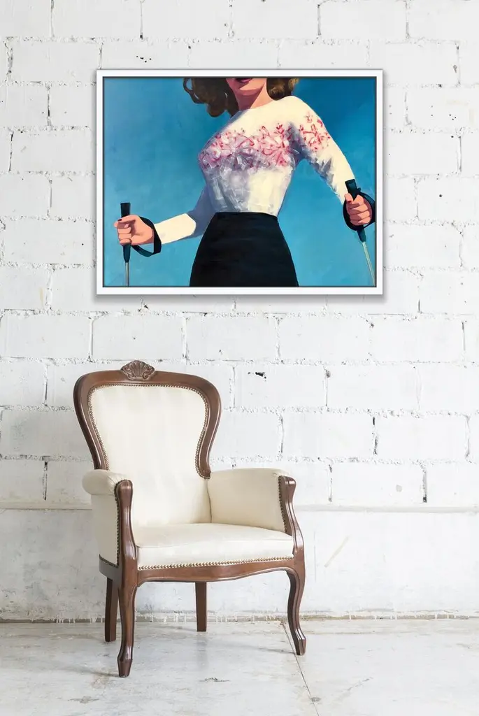 Seen first at One Kings Lane: Inspired by midcentury snapshots and film stills, this piece from T. S. Harris features a woman holding ski poles set against a clear blue backdrop. This work is printed on ultracotton canvas, displayed in a wood floater frame, and arrives ready to hang.The California artist T.S. Harris takes old black-and-white snapshots, often found at flea markets and yard sales, and lights them up with color. Her subjects are nostalgic, like her series on film stars of the 1940s and ’50s and her scenes of long leisurely summers. Harris makes each painting come to life by cropping into each scene, roughing up the paintwork, and weaving in a bright, light-filled palette.