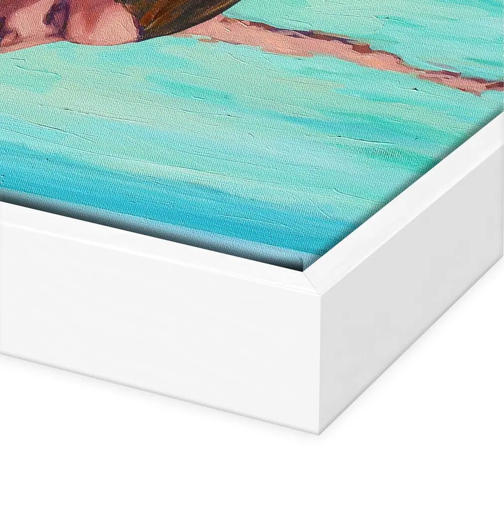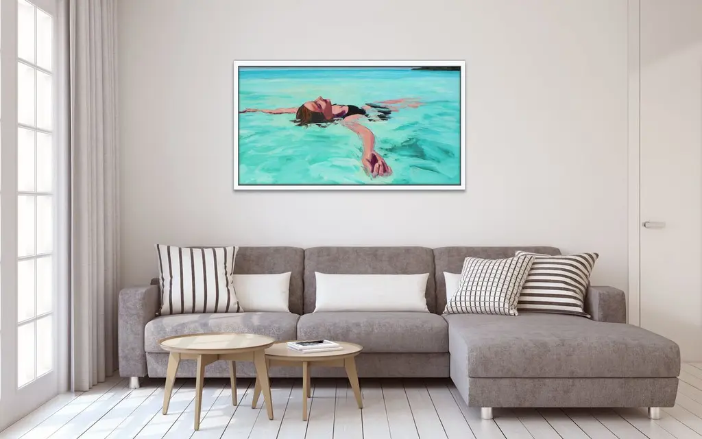 Seen first at One Kings Lane: Inspired by midcentury snapshots and film stills, this piece from T. S. Harris depicts a woman floating in clear, open waters without a care in the world. This work is printed on gallery-wrapped canvas, displayed in a white pine floater frame, and arrives ready to hang.The California artist T.S. Harris takes old black-and-white snapshots, often found at flea markets and yard sales, and lights them up with color. Her subjects are nostalgic, like her series on film stars of the 1940s and ’50s and her scenes of long leisurely summers. Harris makes each painting come to life by cropping into each scene, roughing up the paintwork, and weaving in a bright, light-filled palette.
