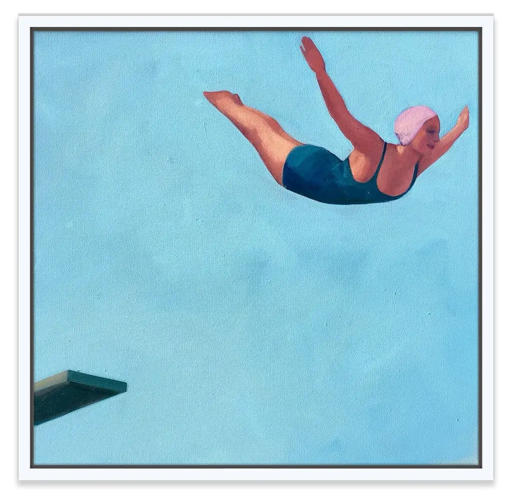 Seen first at One Kings Lane: Inspired by midcentury snapshots and film stills, this piece from T. S. Harris features a woman in the middle of a graceful swan dive. This work is printed on ultracotton canvas, displayed in a wood floater frame, and arrives ready to hang.The California artist T.S. Harris takes old black-and-white snapshots, often found at flea markets and yard sales, and lights them up with color. Her subjects are nostalgic, like her series on film stars of the 1940s and ’50s and her scenes of long leisurely summers. Harris makes each painting come to life by cropping into each scene, roughing up the paintwork, and weaving in a bright, light-filled palette.