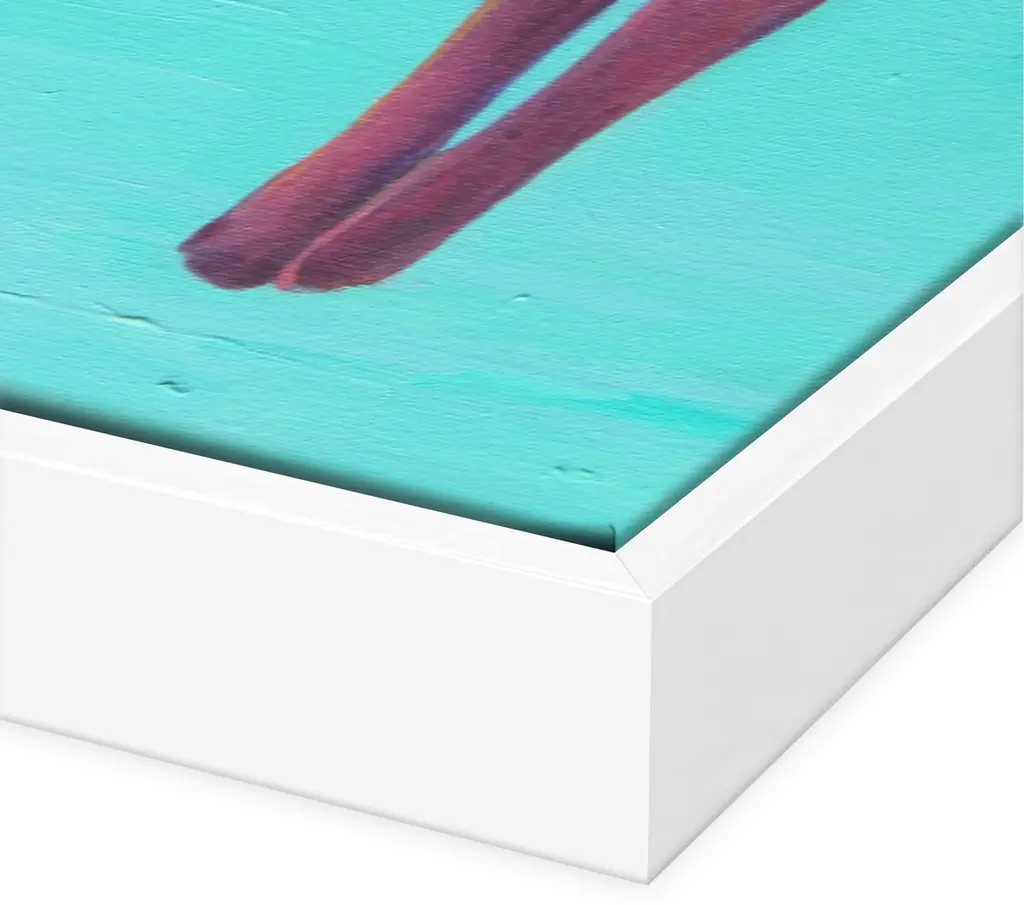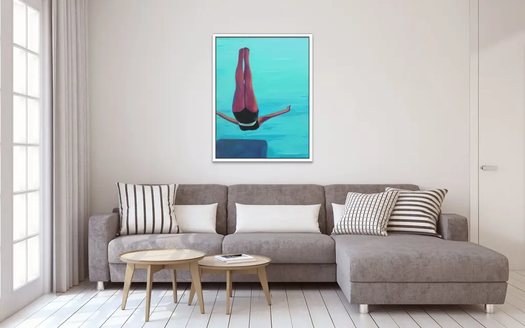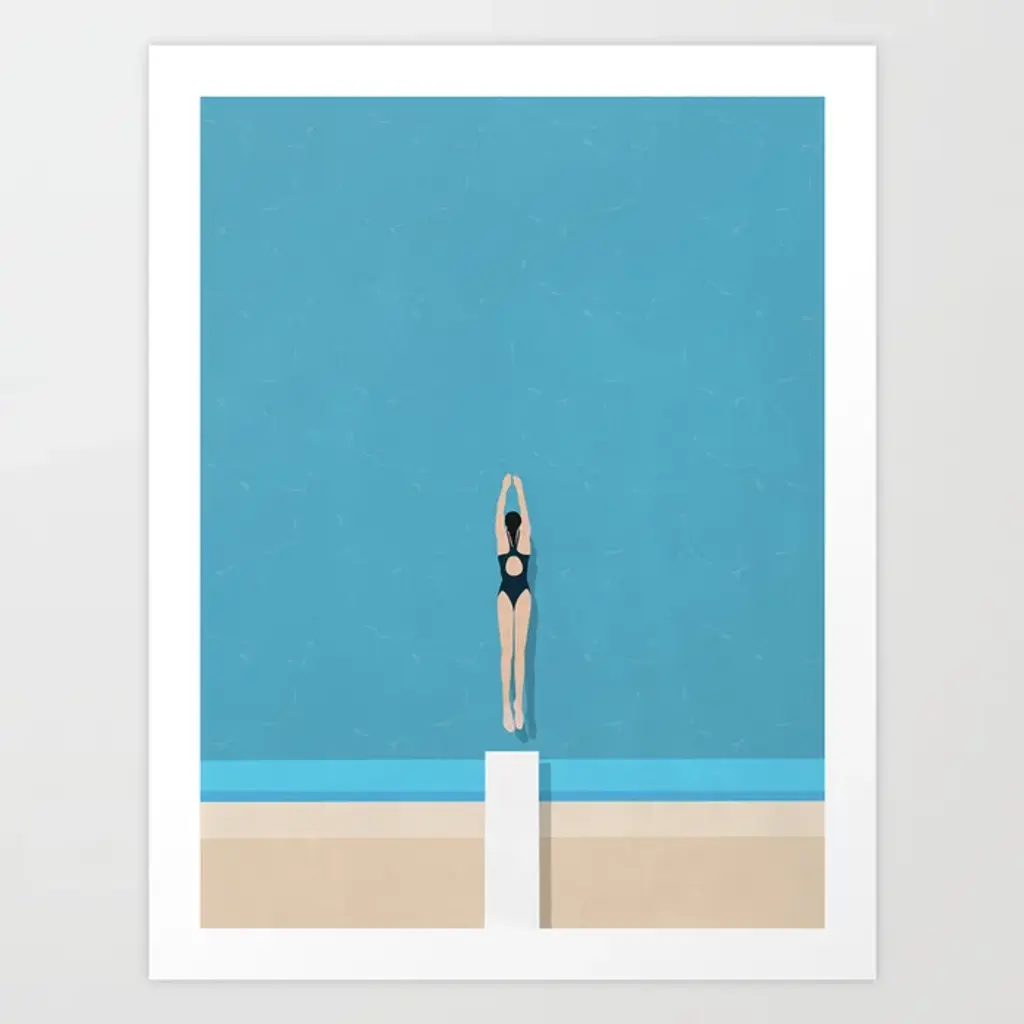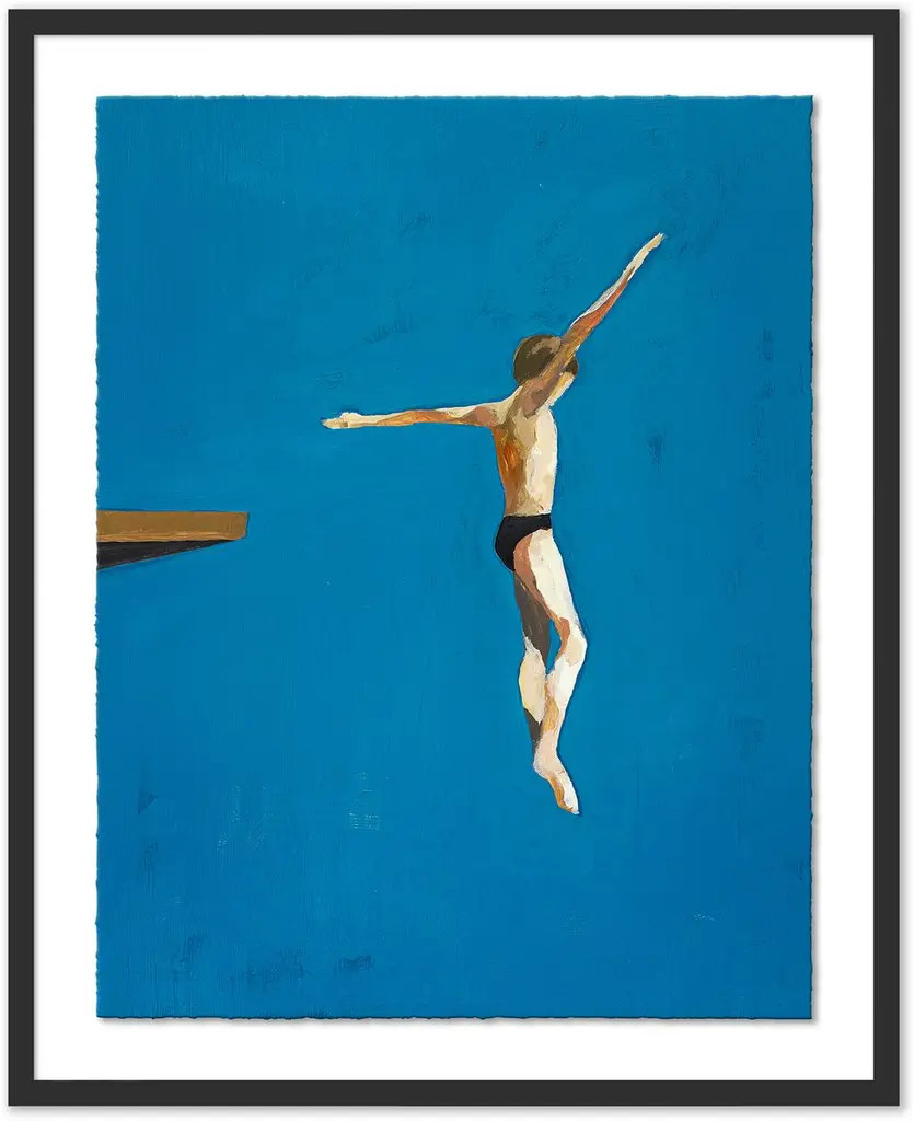 Inspired by midcentury snapshots and film stills, this piece from T. S. Harris features a woman in the middle of a graceful swan dive. This work is printed on gallery-wrapped canvas, displayed in a white pine floater frame, and arrives ready to hang.The California artist T.S. Harris takes old black-and-white snapshots, often found at flea markets and yard sales, and lights them up with color. Her subjects are nostalgic, like her series on film stars of the 1940s and ’50s and her scenes of long leisurely summers. Harris makes each painting come to life by cropping into each scene, roughing up the paintwork, and weaving in a bright, light-filled palette.