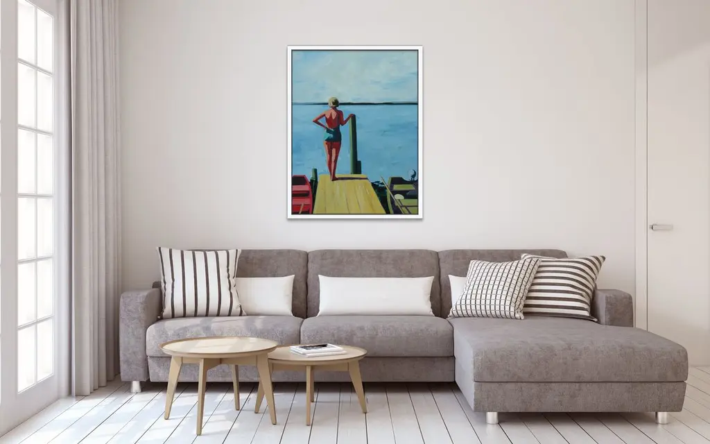 Inspired by midcentury snapshots and film stills, this piece from T. S. Harris features a woman on the dock, enjoying the views of a lake on a carefree summer day. This work is printed on gallery-wrapped canvas, displayed in a white pine floater frame, and arrives ready to hang.The California artist T.S. Harris takes old black-and-white snapshots, often found at flea markets and yard sales, and lights them up with color. Her subjects are nostalgic, like her series on film stars of the 1940s and ’50s and her scenes of long leisurely summers. Harris makes each painting come to life by cropping into each scene, roughing up the paintwork, and weaving in a bright, light-filled palette.