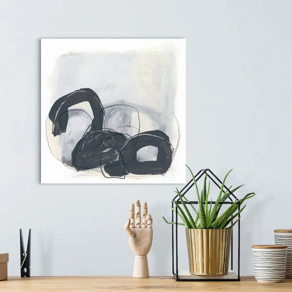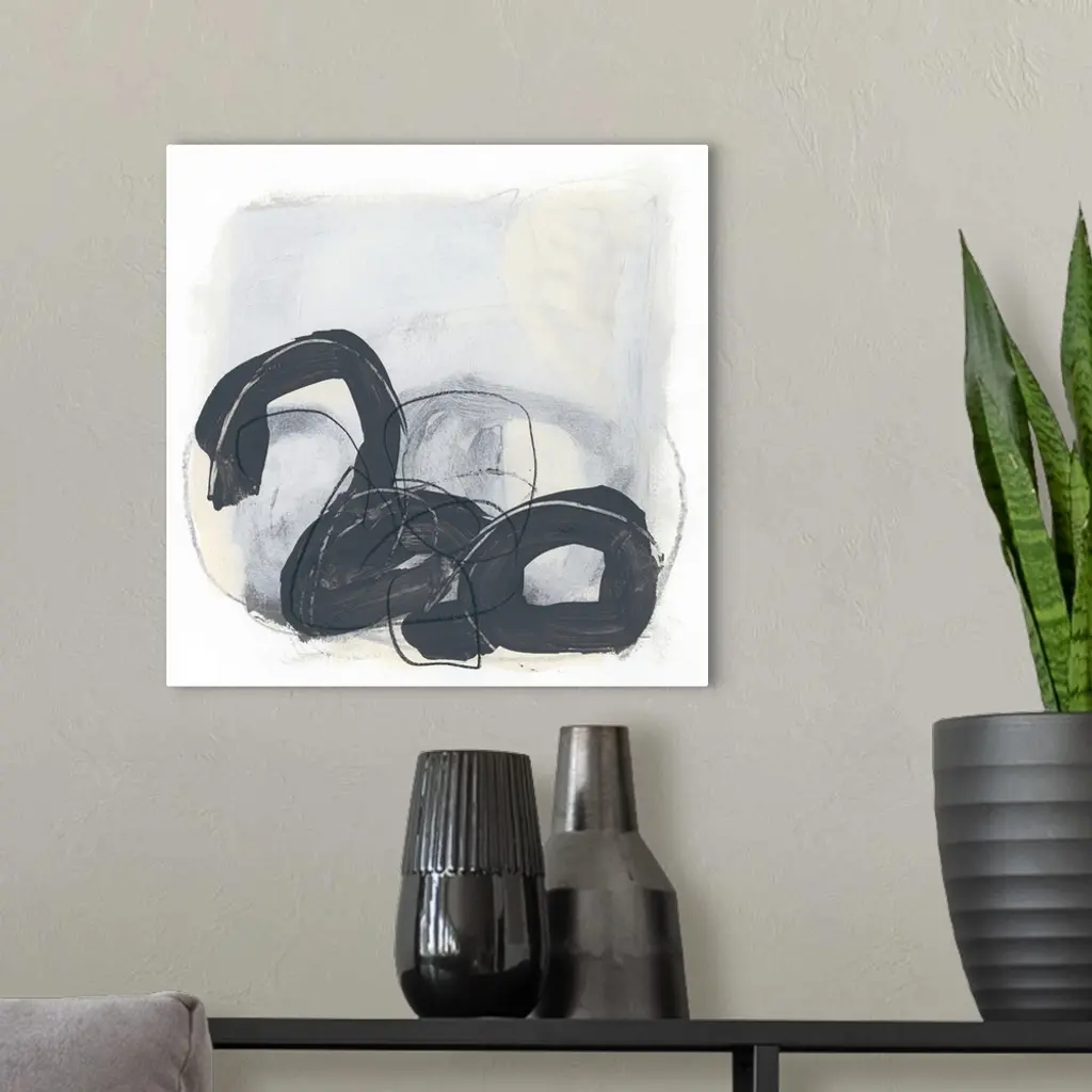 Square abstract painting of thick black circles overlapping and fine scribble lines of gray and black on a gray and cream backdrop.
