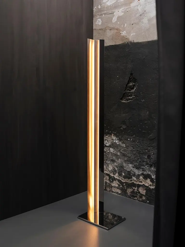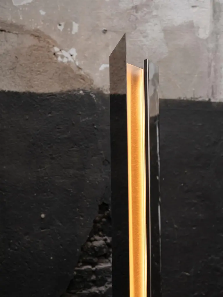 A metal sheet, simple and precise folds, a light. Inspired by the gesture of the hand protecting a candle flame, the Mano Light collection is designed as abstract sketches whose proportions can be adapted to different scales. Standing Mano is one of the protagonists of the series, a two-meter luminous sculpture, with a distinctive design and planning, which gives off a warm and enveloping light. Table Mano is an elegant and refined table lamp, of contained dimensions, which diffuses a discreet and delicate glow. Designed by Umberto Bellardi Ricci, Mano Light is available in two finishes, both with a polished stainless steel base.