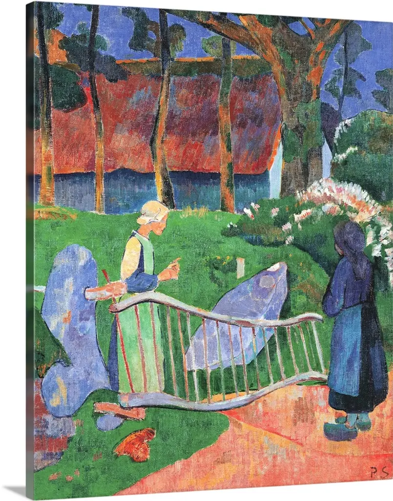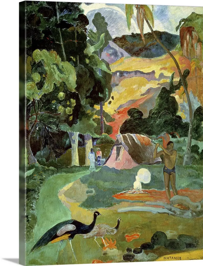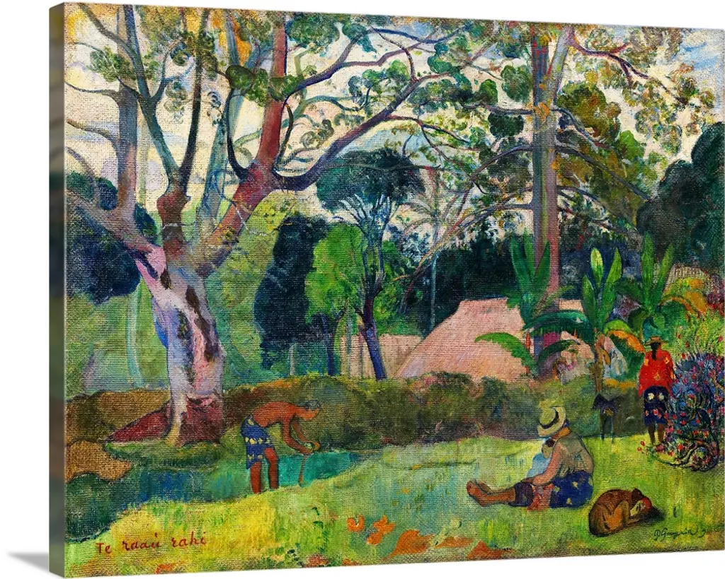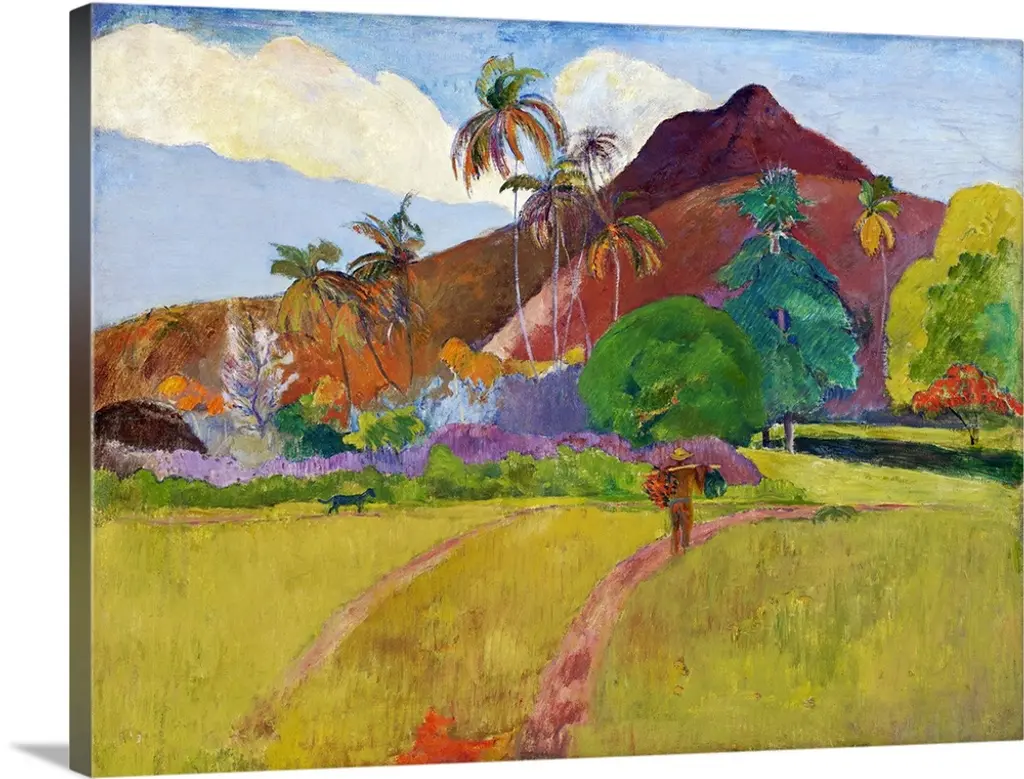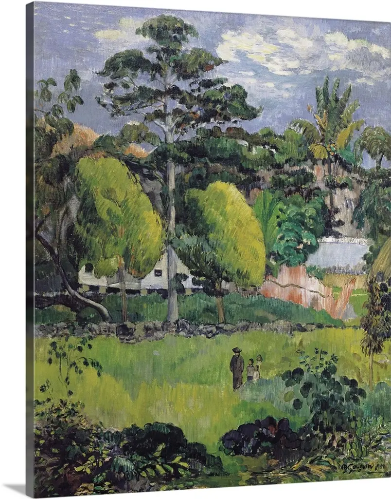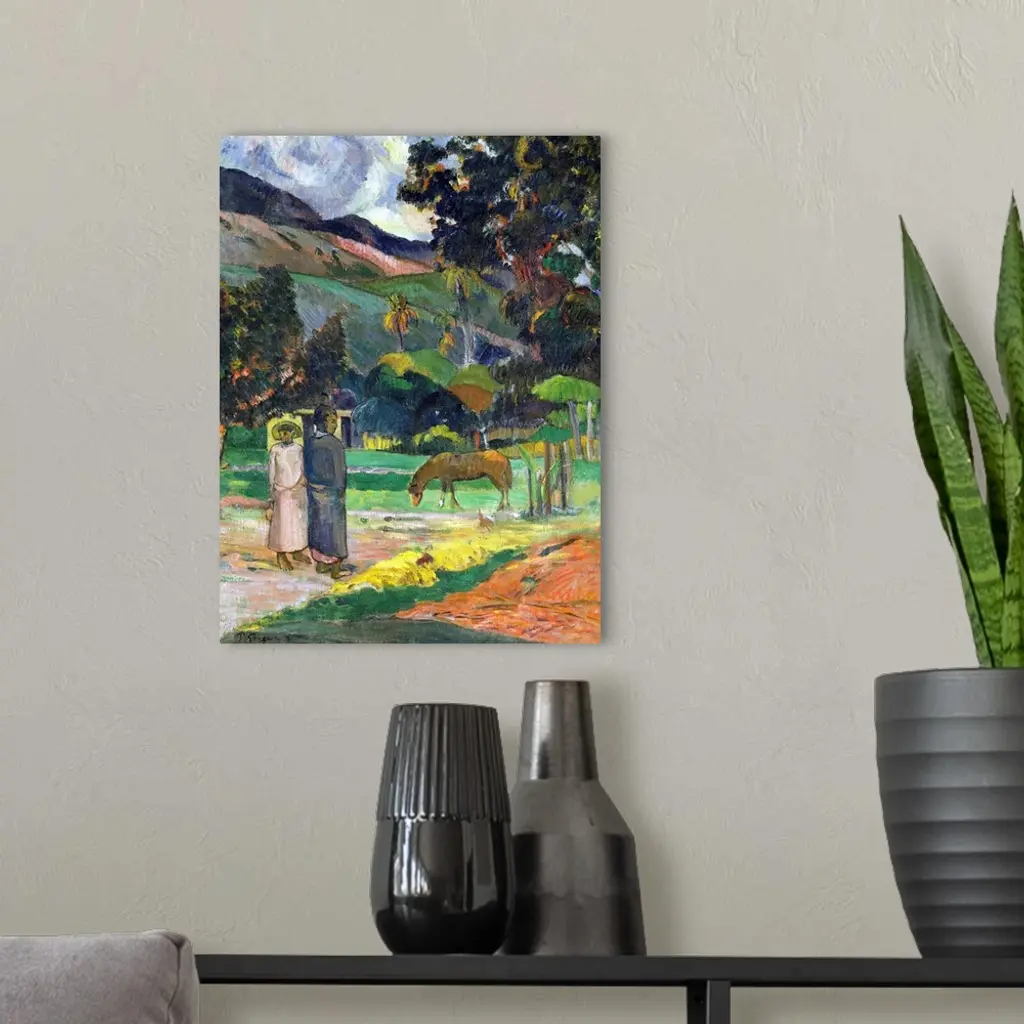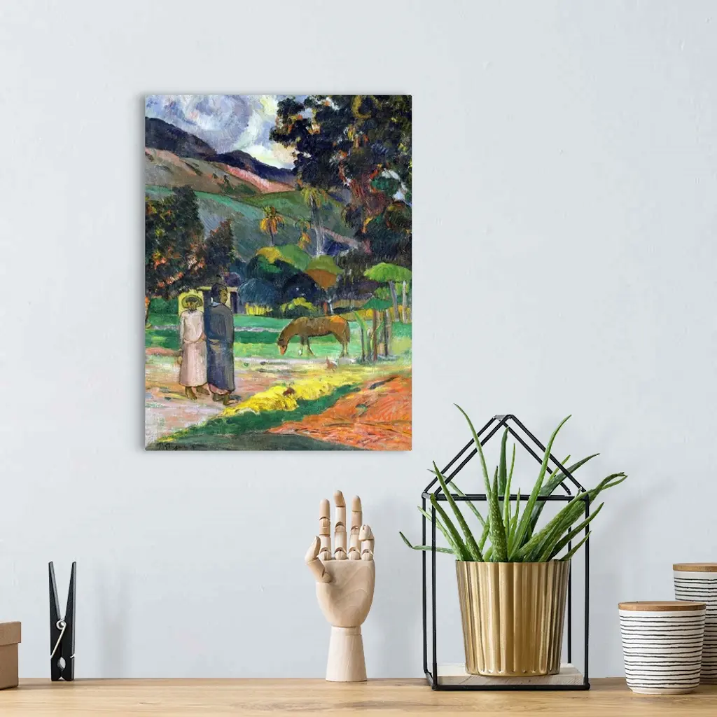 Although the authorship of this picture was once questioned, cleaning and reexamination have securely demonstrated that it is one of a group of landscapes that Gauguin painted during his first Tahitian sojourn, showing small figures and a hut amid tropical greenery. There are drawings related to the couple and the horse in this picture, attesting to the artist's eye for local detail. This was the first painting by Gauguin to enter the Metropolitan's collection, by donation in 1939.