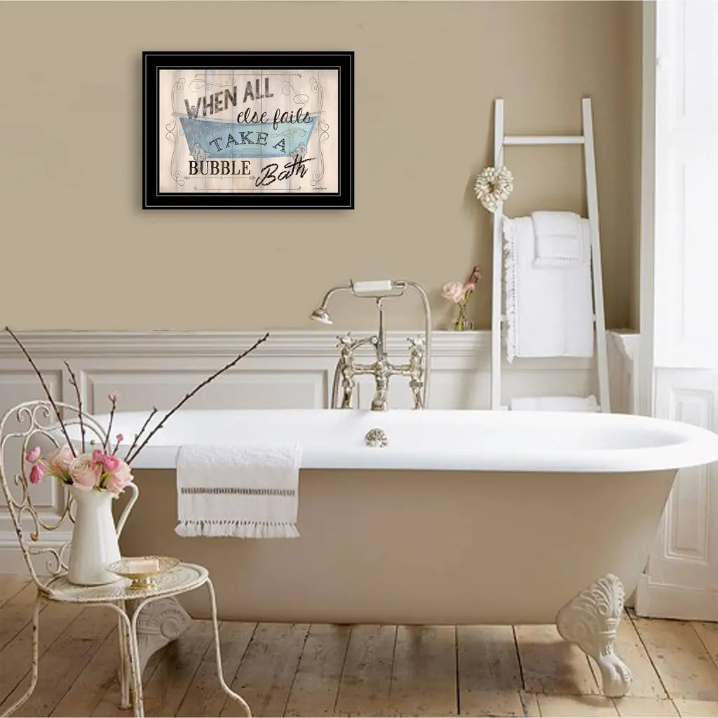 This take a bubble bath 2 black framed print wall art will add a beautiful decorative accent to your decor. This print is a visual artistic expression that allows you to decorate your space in style. Reproduced for you on paper, this hanging decorative accent will be a trendy and fashionable way to dress your walls. Hang on your wall to add some up to date fashion and decoration. Utilize this opportunity to create a focal point in the room with this fabulous wall decor option. 15" H x 19" W x 1" D